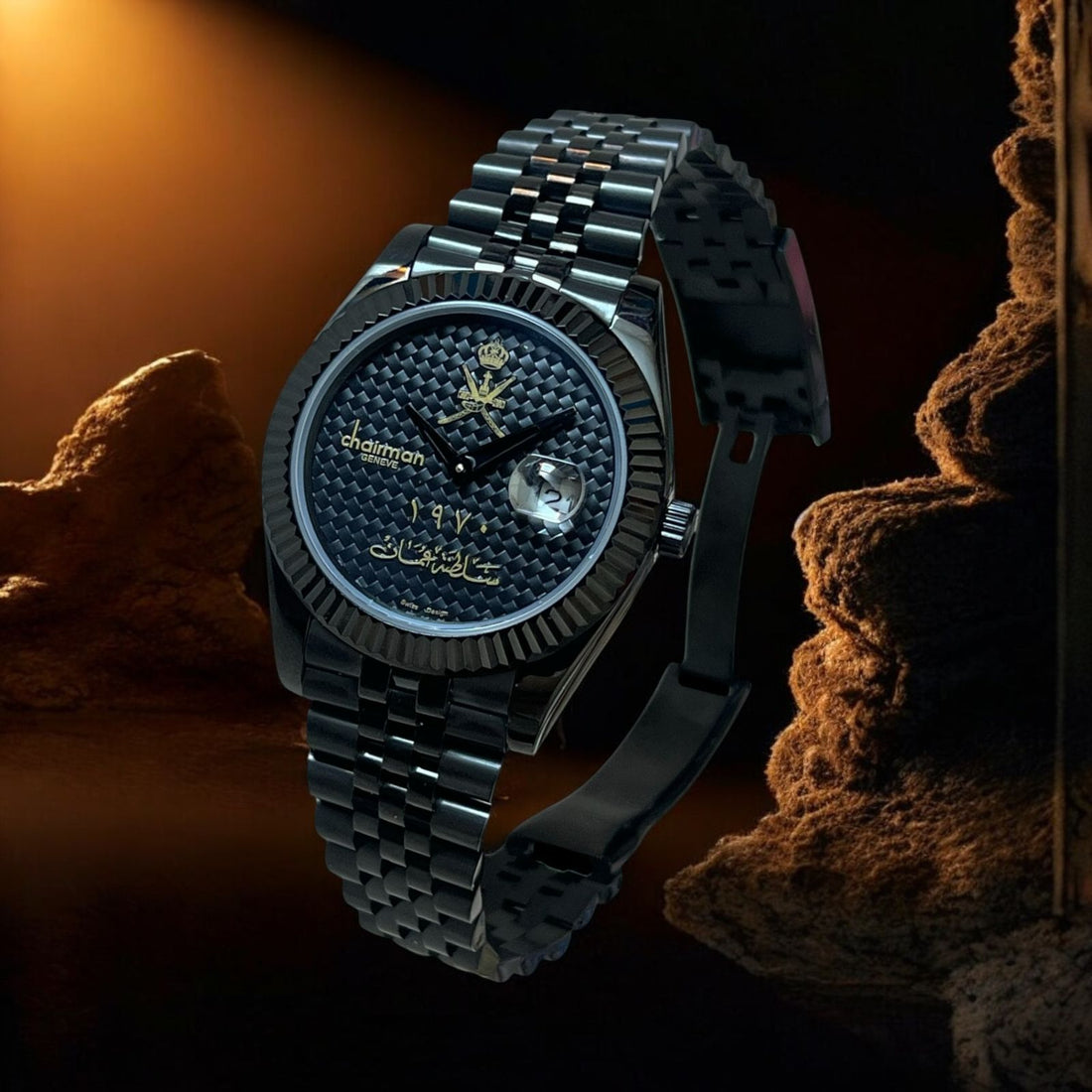 Elevate your style with the OMAN Emblem Dated Chairman Geneve watch, featuring a sleek black...