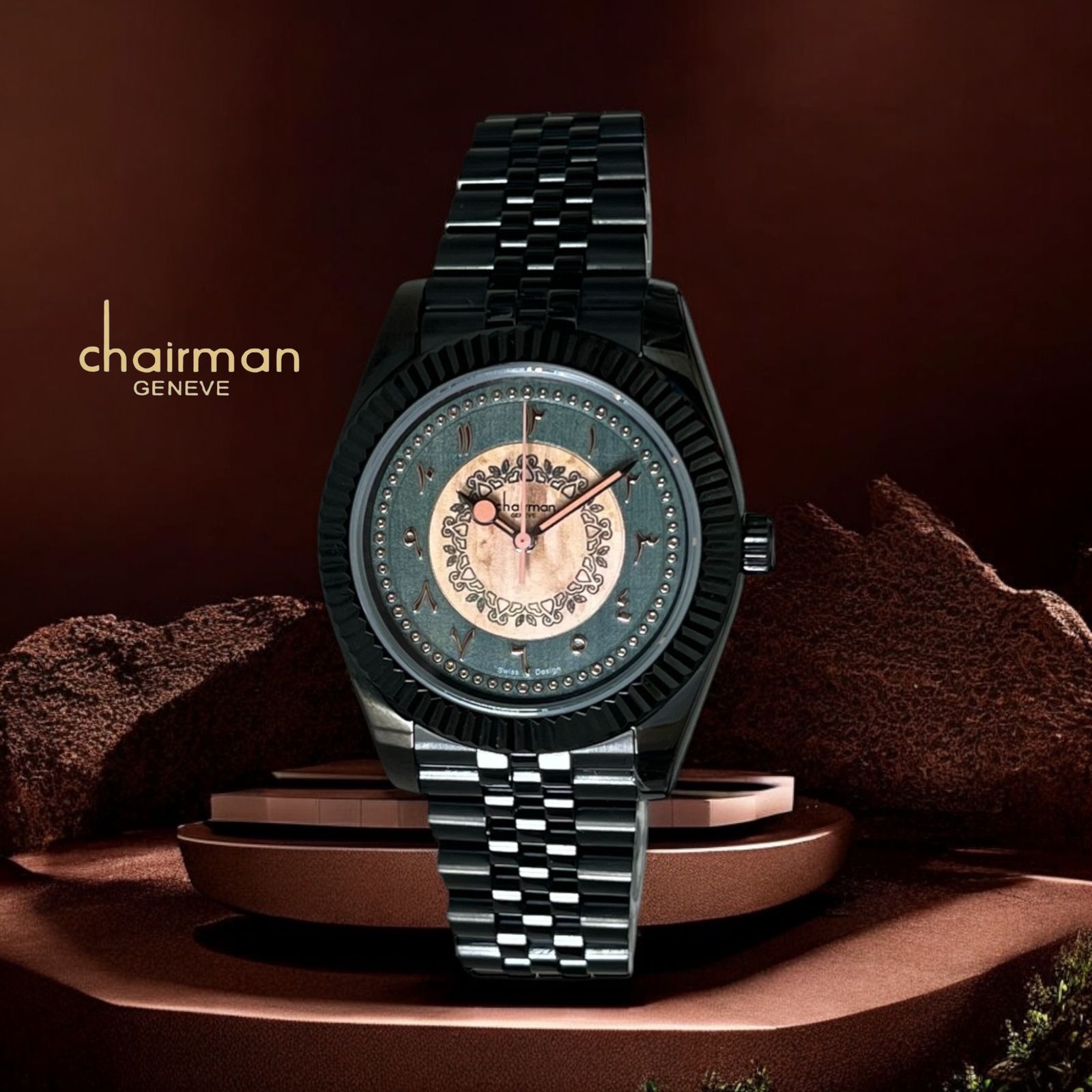 Introducing the Chairman Geneve Arabic Green And Beige Dial Black Chain Gents Watch - crafted for the sophisticated gentleman. With an elegant green and beige dial, this watch exudes class and style. The black chain completes the look, making it a must-have accessory for any formal occasion.