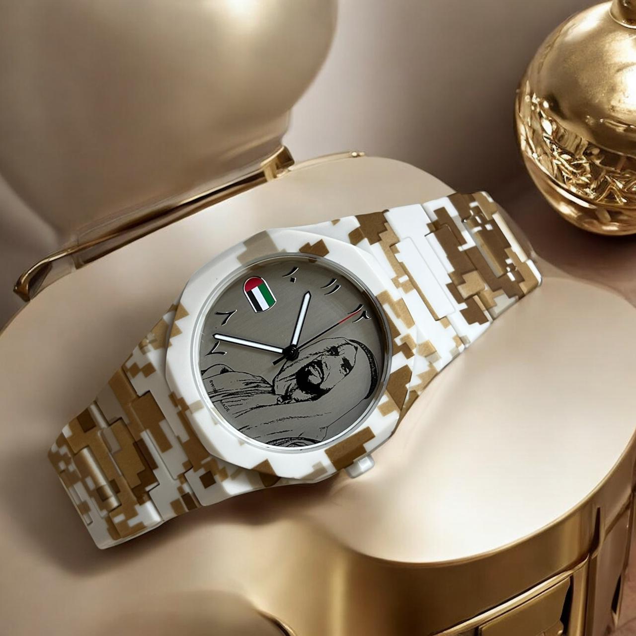 Experience elegance with the Chairman Geneve Gents Watch, featuring a distinctive grey dial accented by the iconic UAE flag and Arabic numerals. Its white and brown chain strap offers a stylish contrast, perfect for adding a touch of sophistication to any outfit. Designed for the modern gentleman, this watch combines cultural pride with timeless craftsmanship.