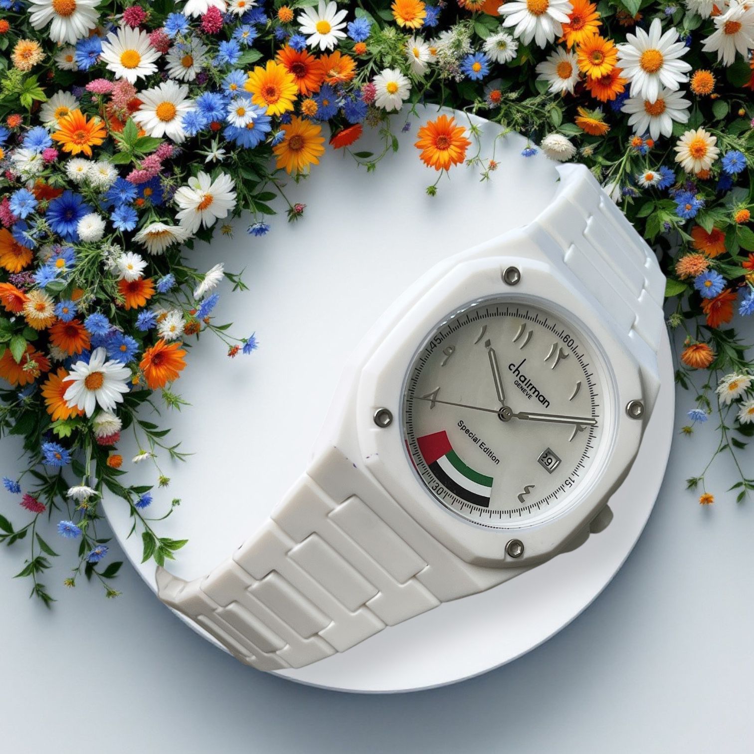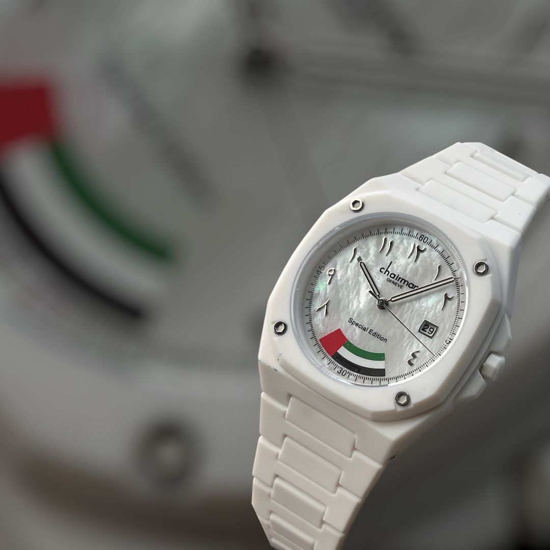 Elevate your style with the Chairman Geneve UAE Flag Arabic Dated Dial White Poly Carbon Gents Watch. Featuring a distinctive white dial adorned with the UAE flag and Arabic numerals, this timepiece blends cultural pride with elegant design. Its dated dial ensures you stay punctual while making a bold statement. Perfect for the modern gentleman who values tradition and sophistication.