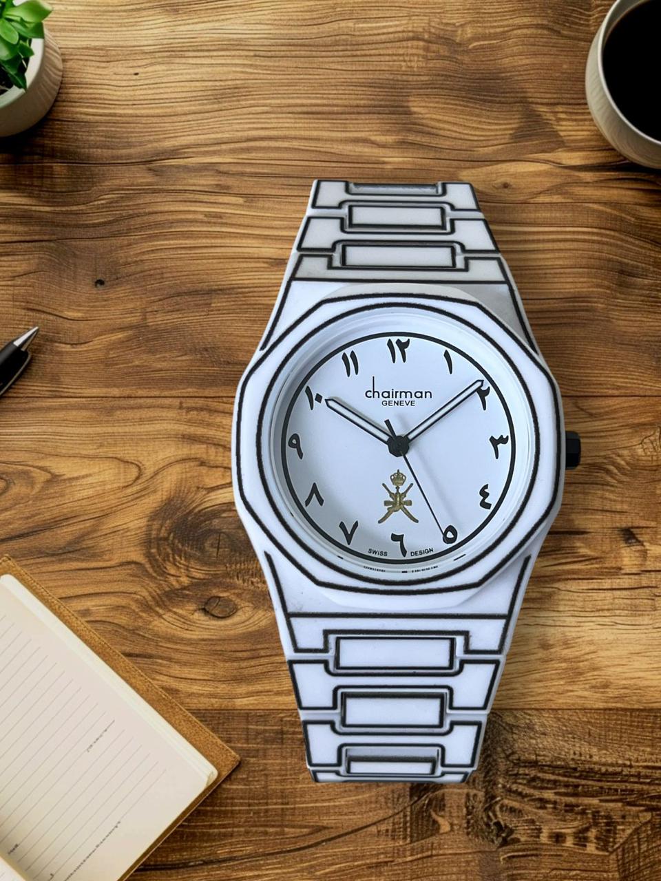 Elevate your style with the Chairman Geneve White Arabic Dial Swiss Design Watch. This sleek and sophisticated timepiece features a beautifully designed white Arabic dial with black accents, exuding elegance and class. Swiss precision and quality ensure accurate timekeeping, making it the perfect accessory for the modern gentleman.