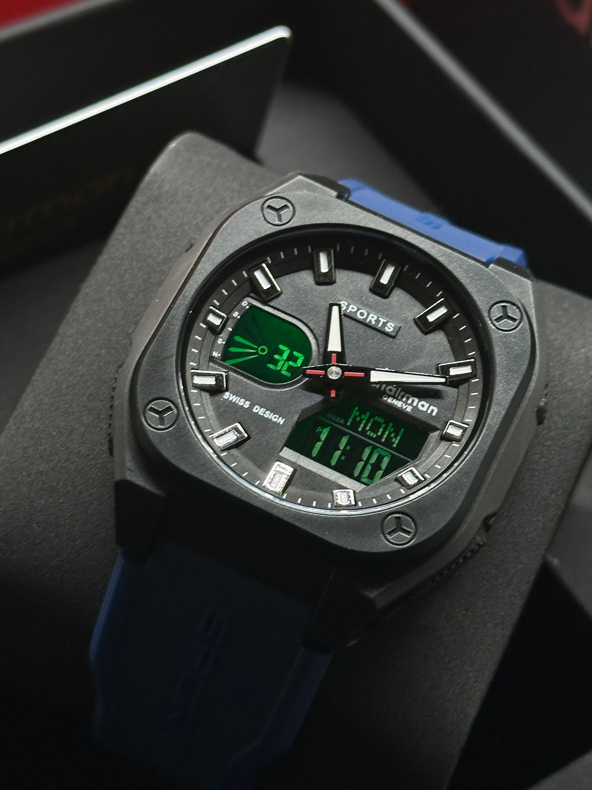 Elevate your style with the Sports Chairman Geneve Black Dial Blue Strap Gents Watch. Featuring a sleek black dial paired with a vibrant blue strap, this watch offers a modern and sporty look. Designed for everyday wear, it combines durability with elegance, making it perfect for both casual outings and active lifestyles. Experience reliable timekeeping while showcasing a bold statement on your wrist.