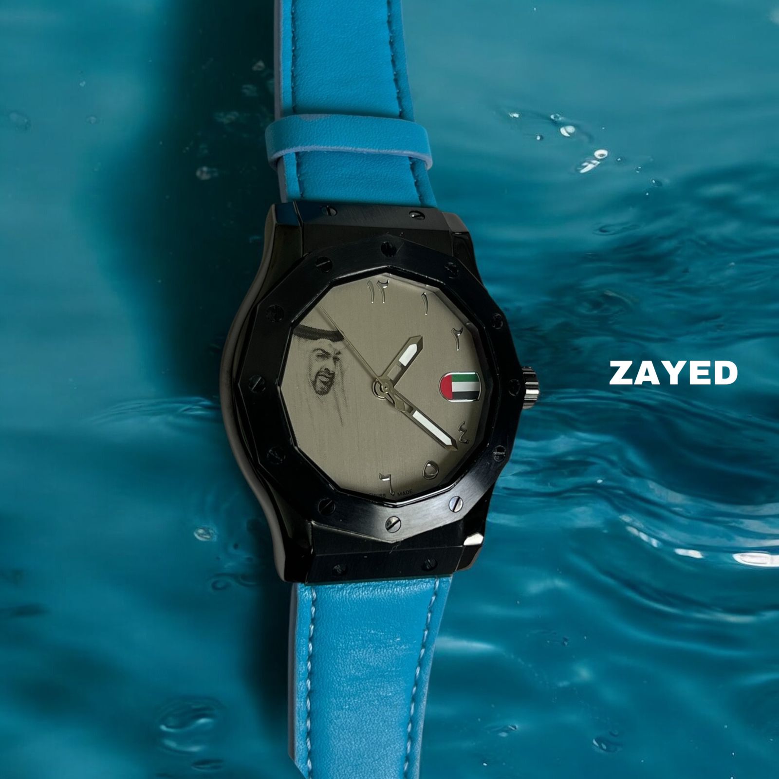 Zayed UAE Flag Grey Arabic Dial Sky Blue Strap Watch