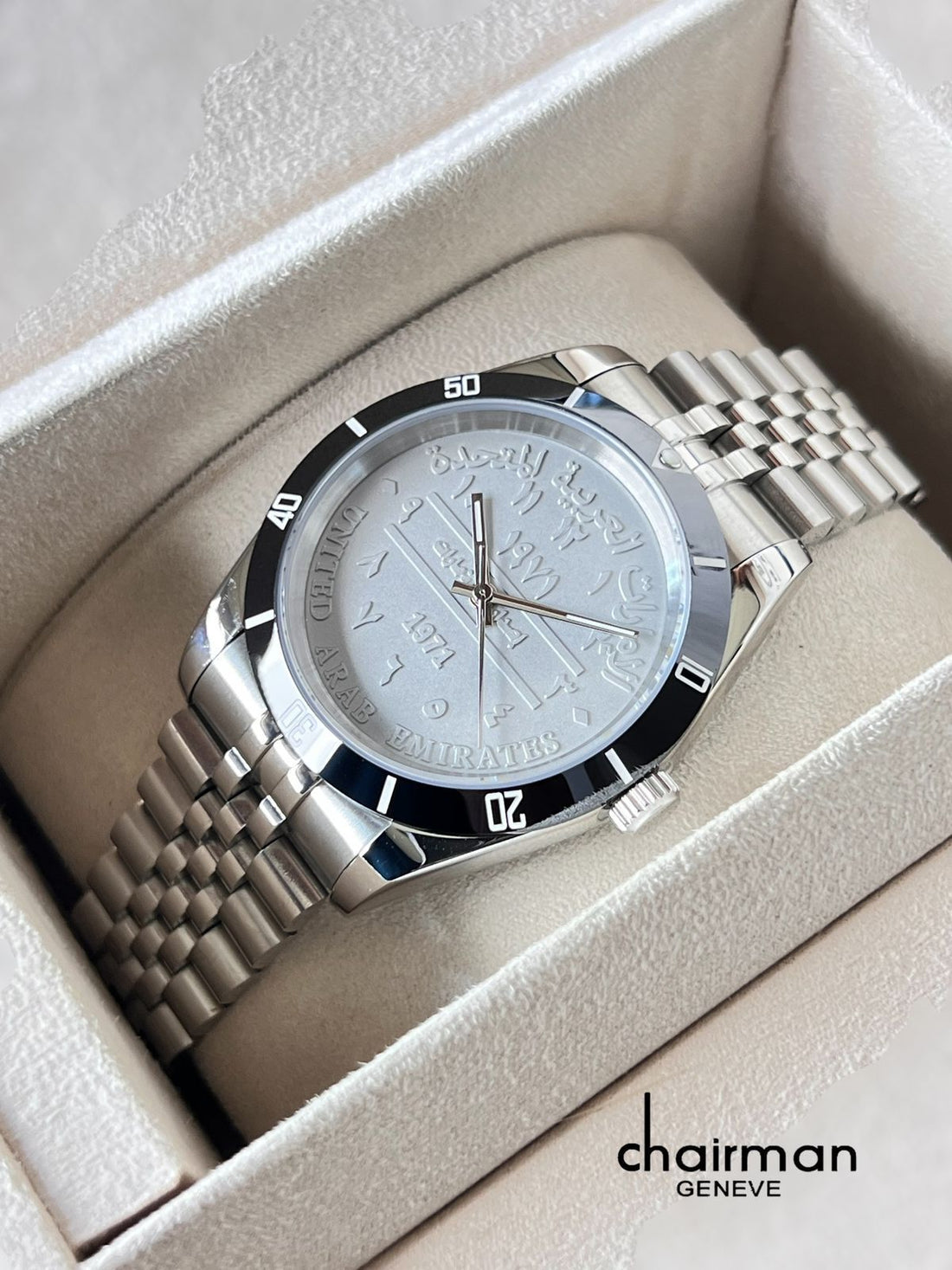 Chairman Geneve UAE Emblem Flag Arabic White Dial Silver Chain Gents Watch