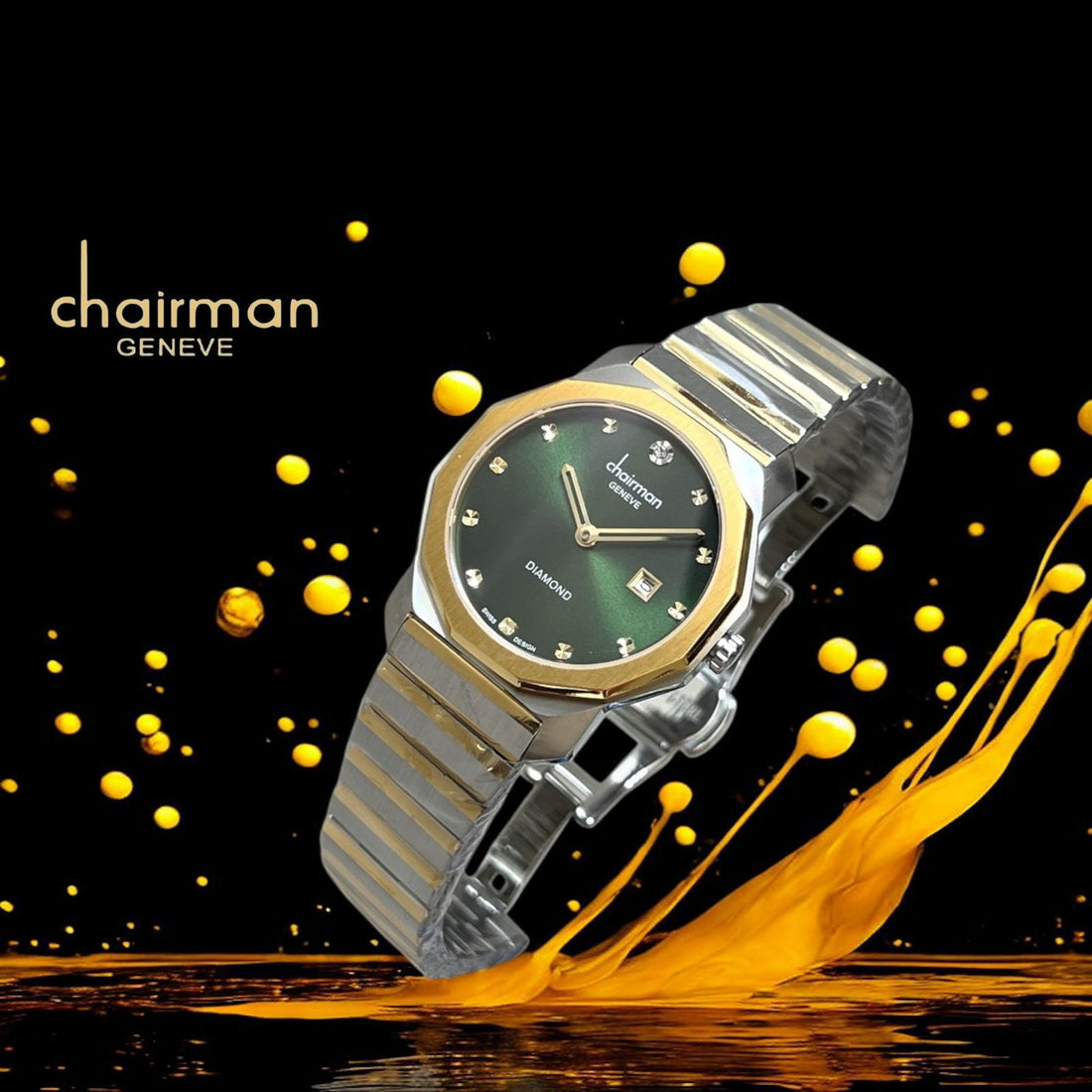 Chairman Geneve Diamond Dated Green Dial Silver And Gold Chain Gents Watch