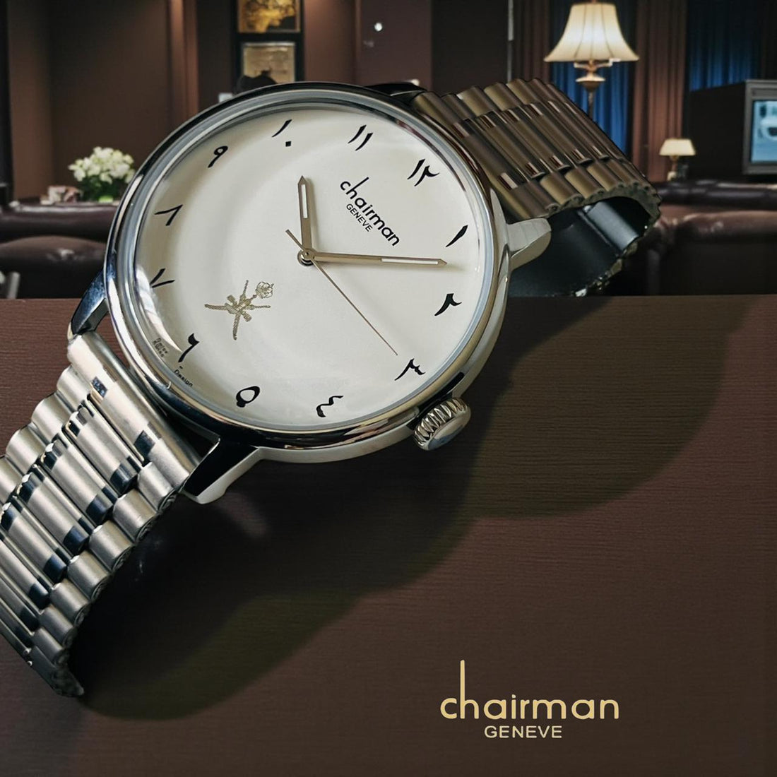 Chairman Geneve OMAN Emblem Arabic White Dial Silver Chain Gents Watch