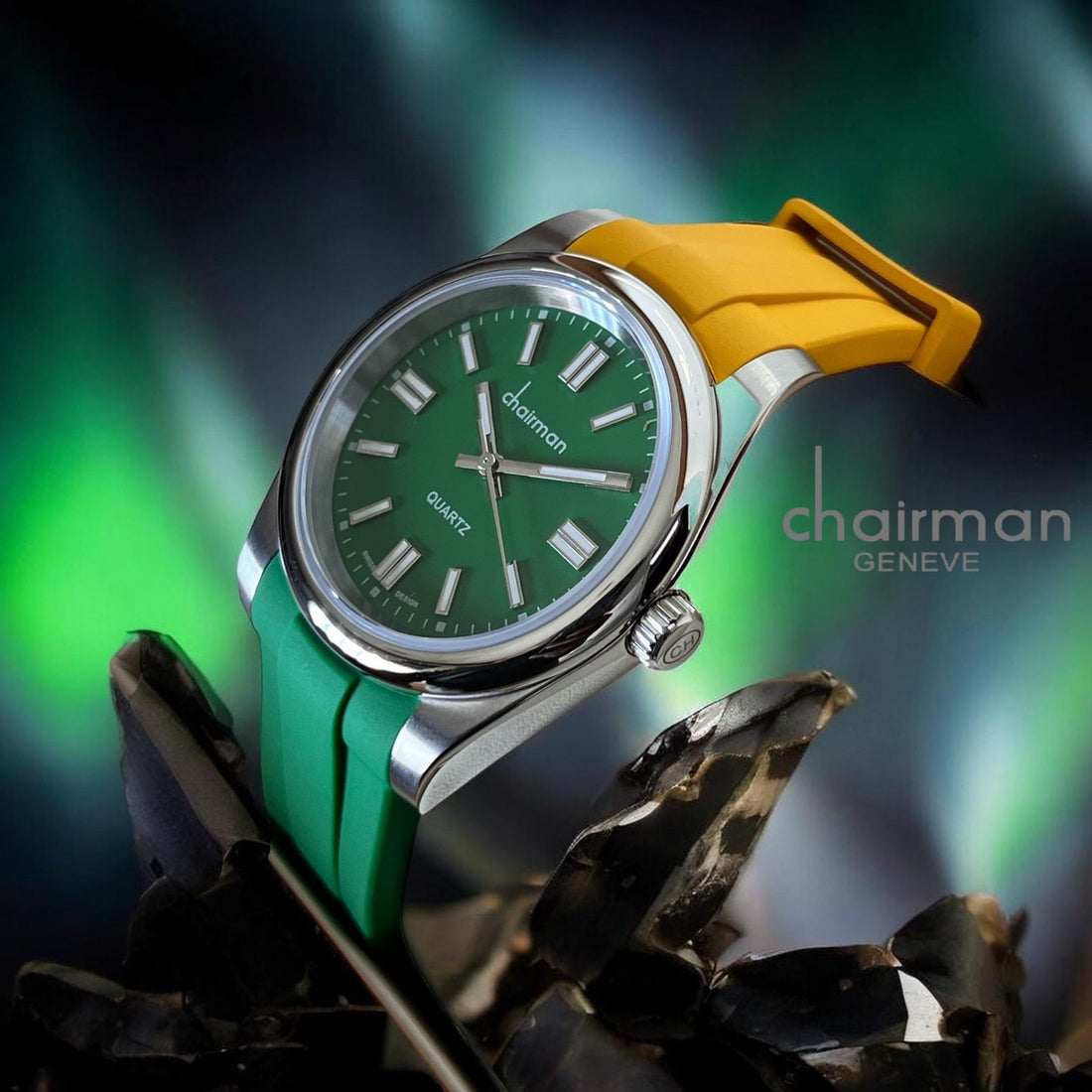 Quartz Chairman Geneve Green Dial Green And Yellow Strap Gents Watch