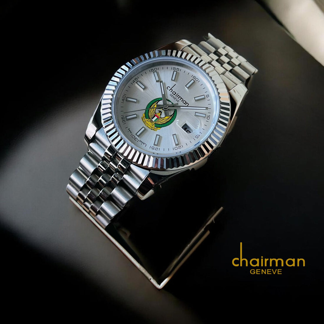 UAE Flag Sheik Chairman Geneve Arabic White Dial Black Chain Gents Watch