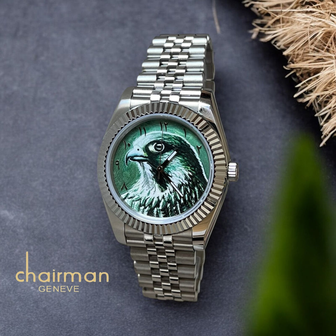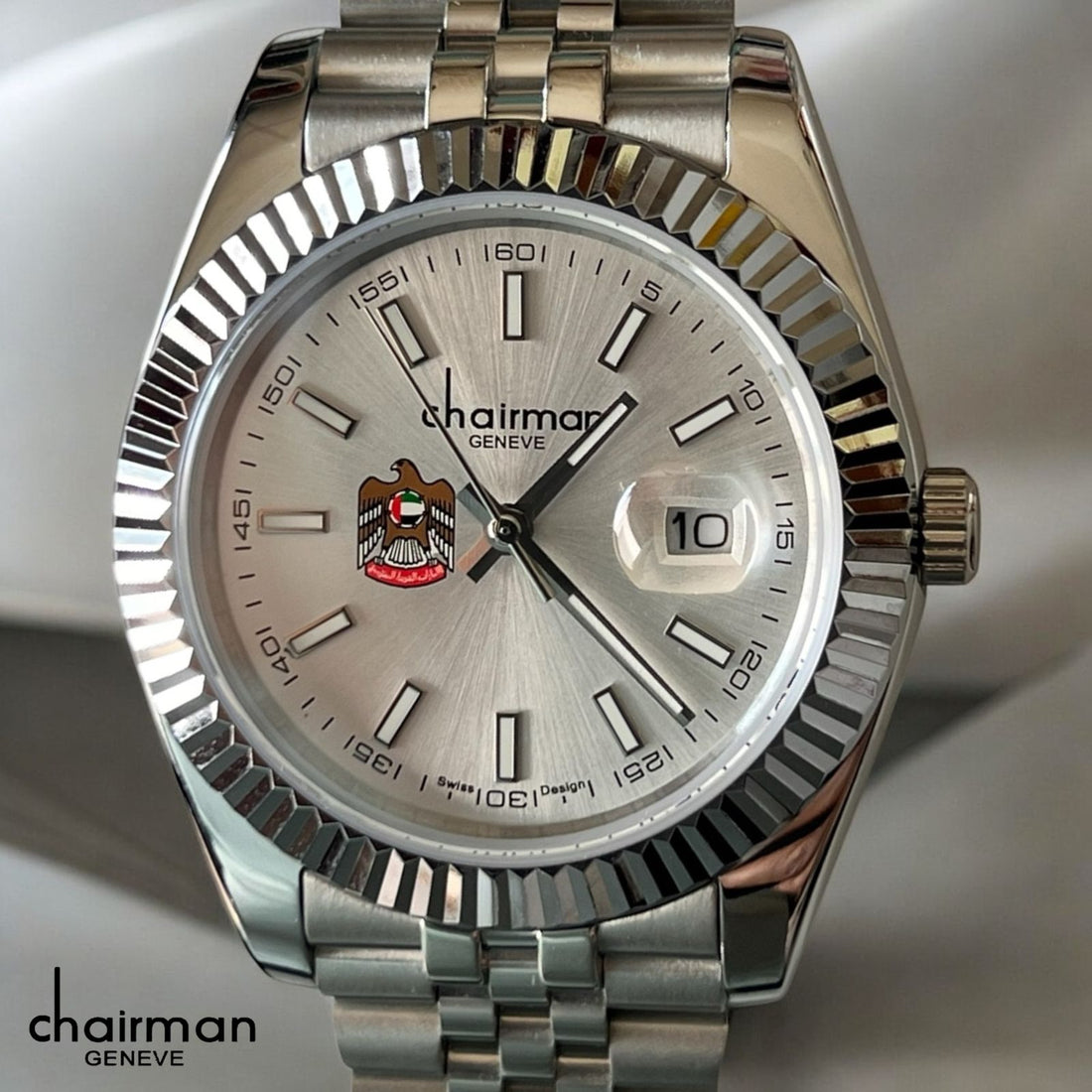 Chairman Geneve Dated UAE Emblem Grey Dial Silver Chain Gents Watch