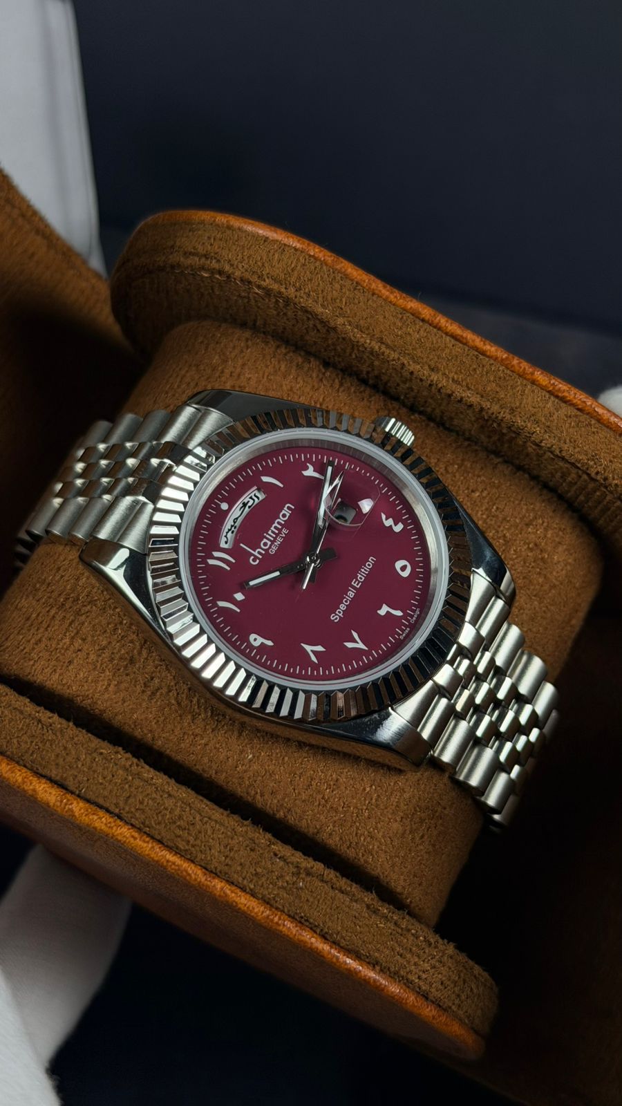 Chairman Geneve Arabic Dated Maroon Dial Silver Chain Gents Watch
