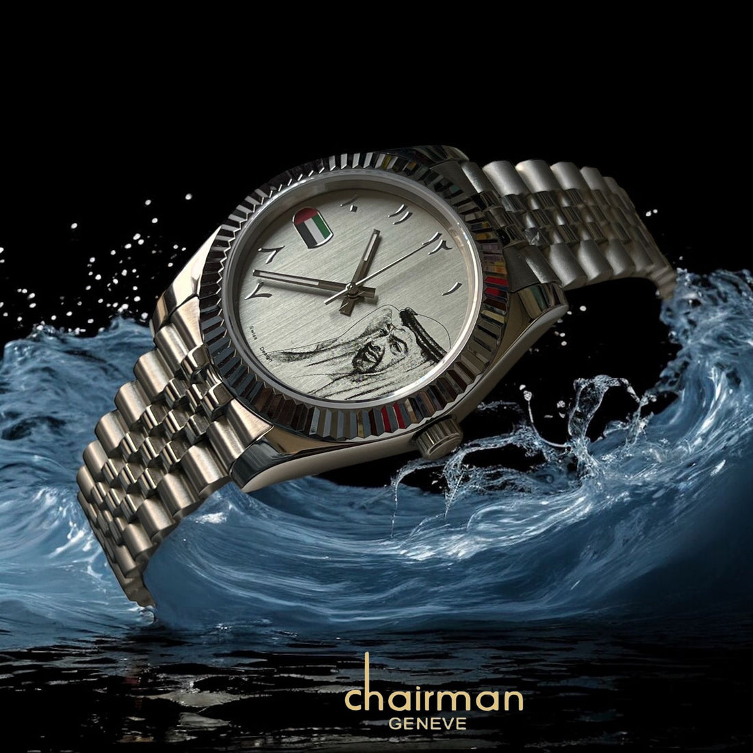 Elevate your wrist with this distinguished UAE Sheik Flag Photo Chairman Geneve timepiece, designed for...