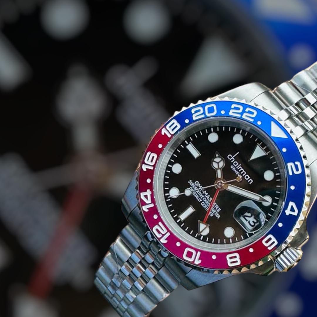 Elevate your style with the Gmt Masteri Dual Dial Swiss Made Black Dial Rolex Style...