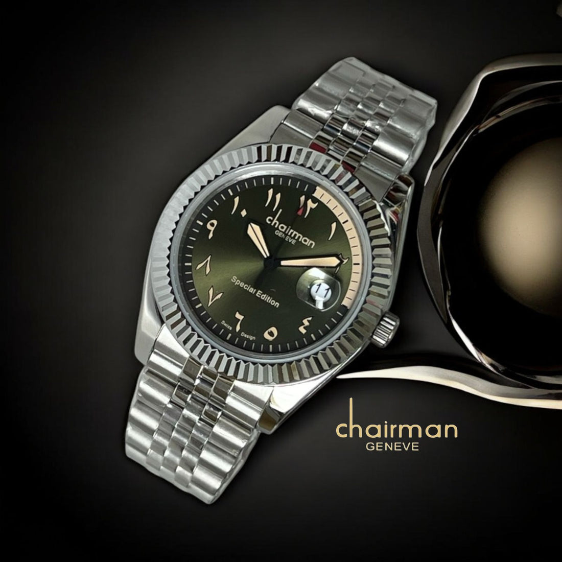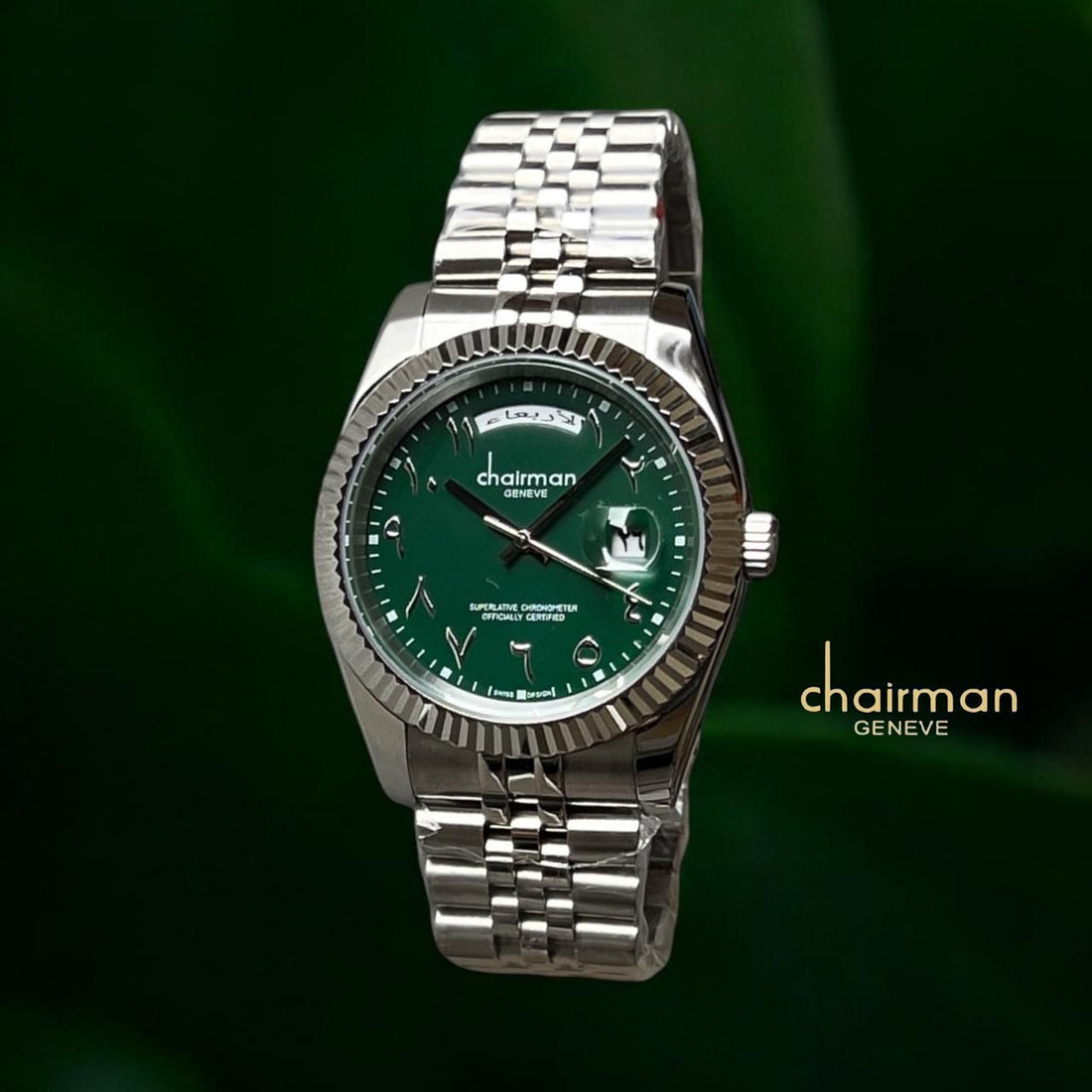 Chairman Geneve Arabic Day And Dated Green Dial Silver Chain Gents Watch