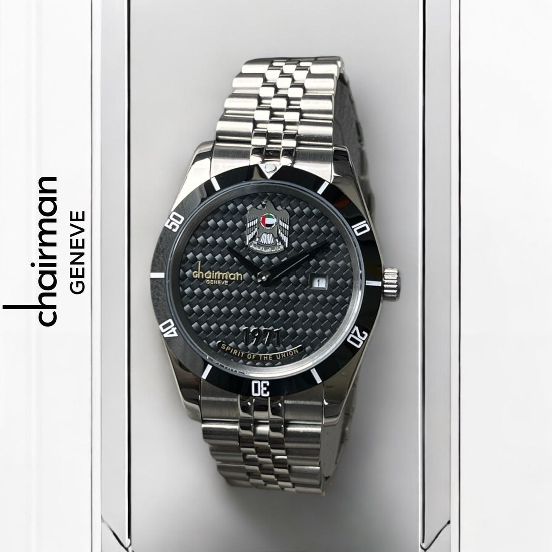 UAE Emblem Chairman Geneve Dated Black Dial Silver Chain Gents Watch