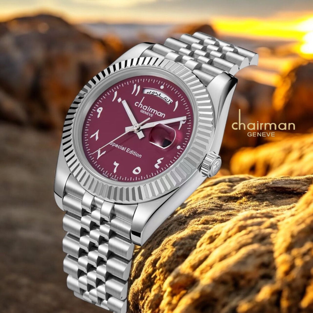 Elevate your style with the Chairman Geneve Gents Watch, featuring a rich maroon Arabic dial...