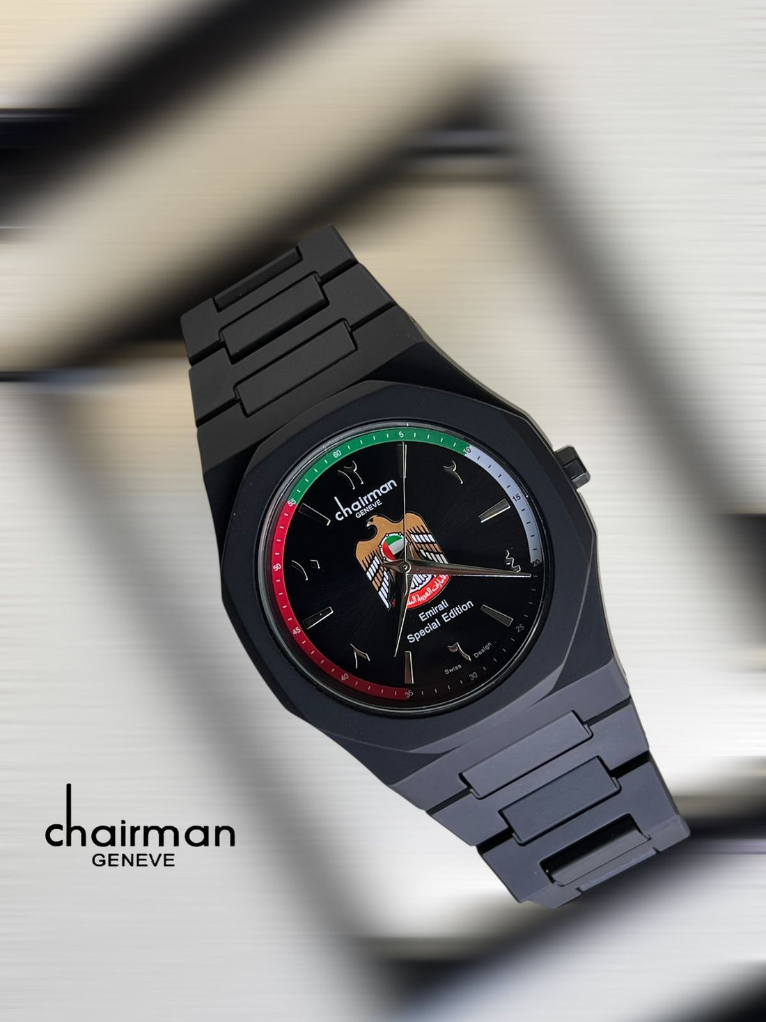 Experience timeless elegance with the Emirati Special Edition Chairman Geneve watch. Featuring a bold black...
