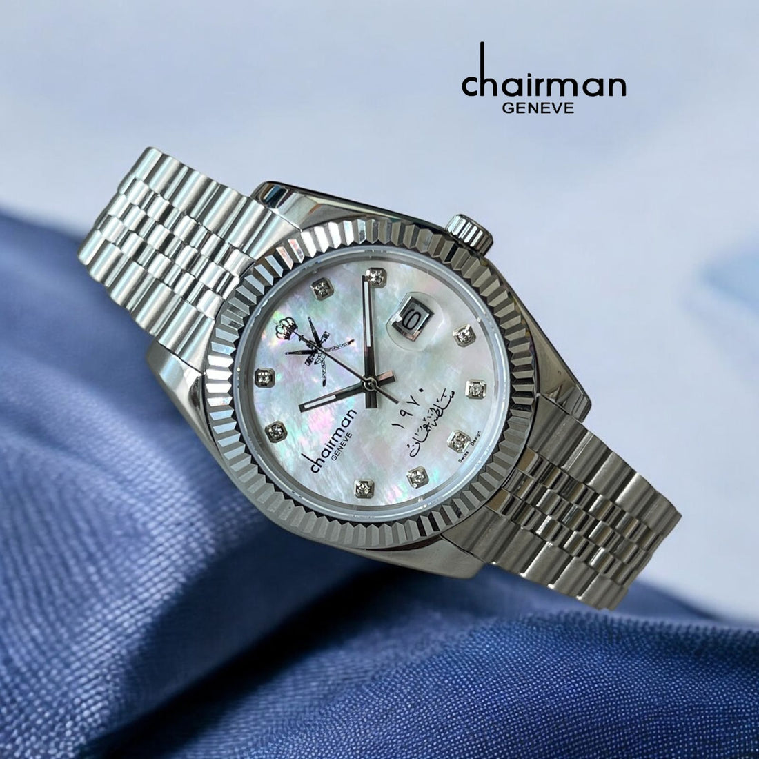 Elevate your style with our White Marble Dial Dated Chairman Geneve Silver Chain Gents Watch....