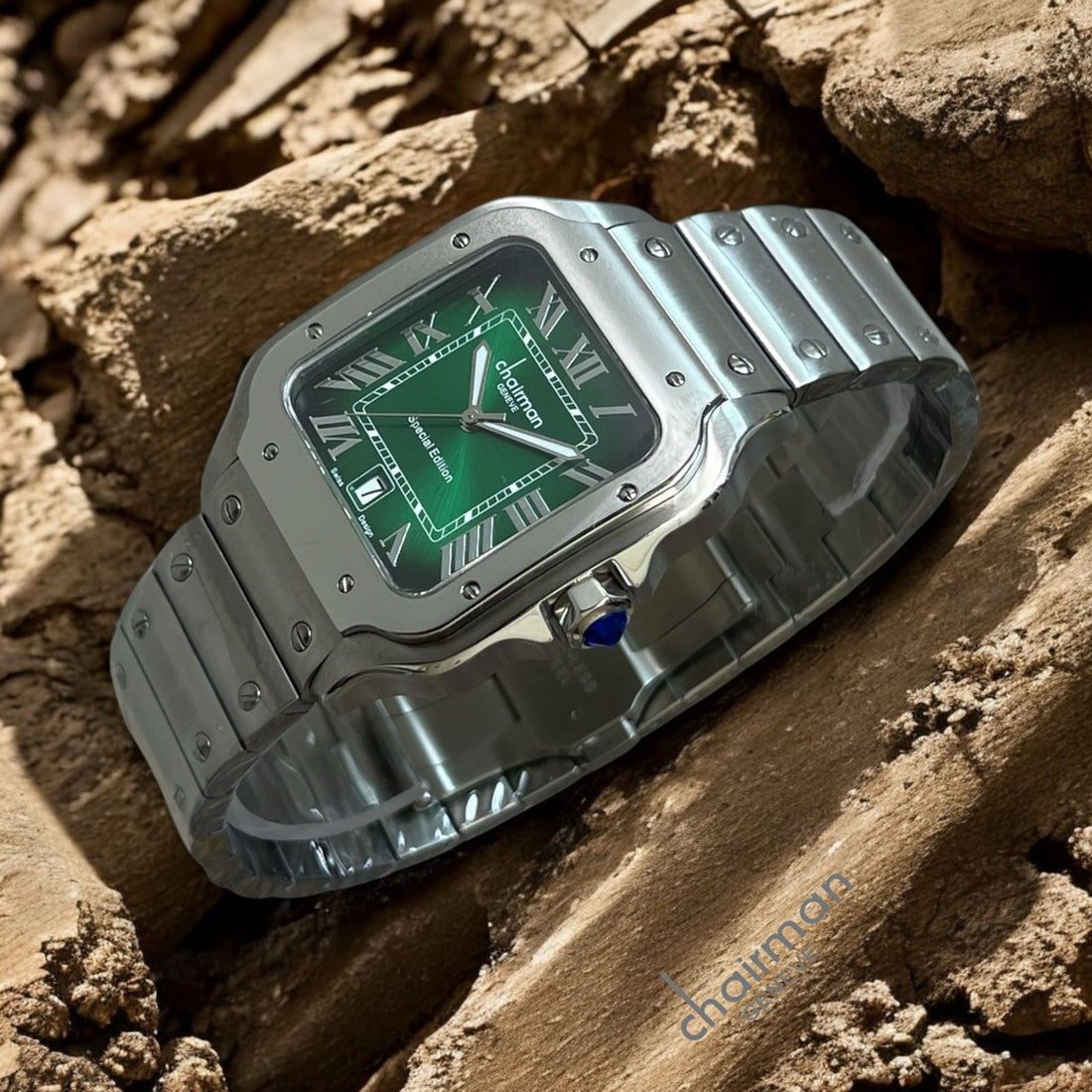 Roman Green Dated Dial Chairman Geneve Silver Chain Gents Watch