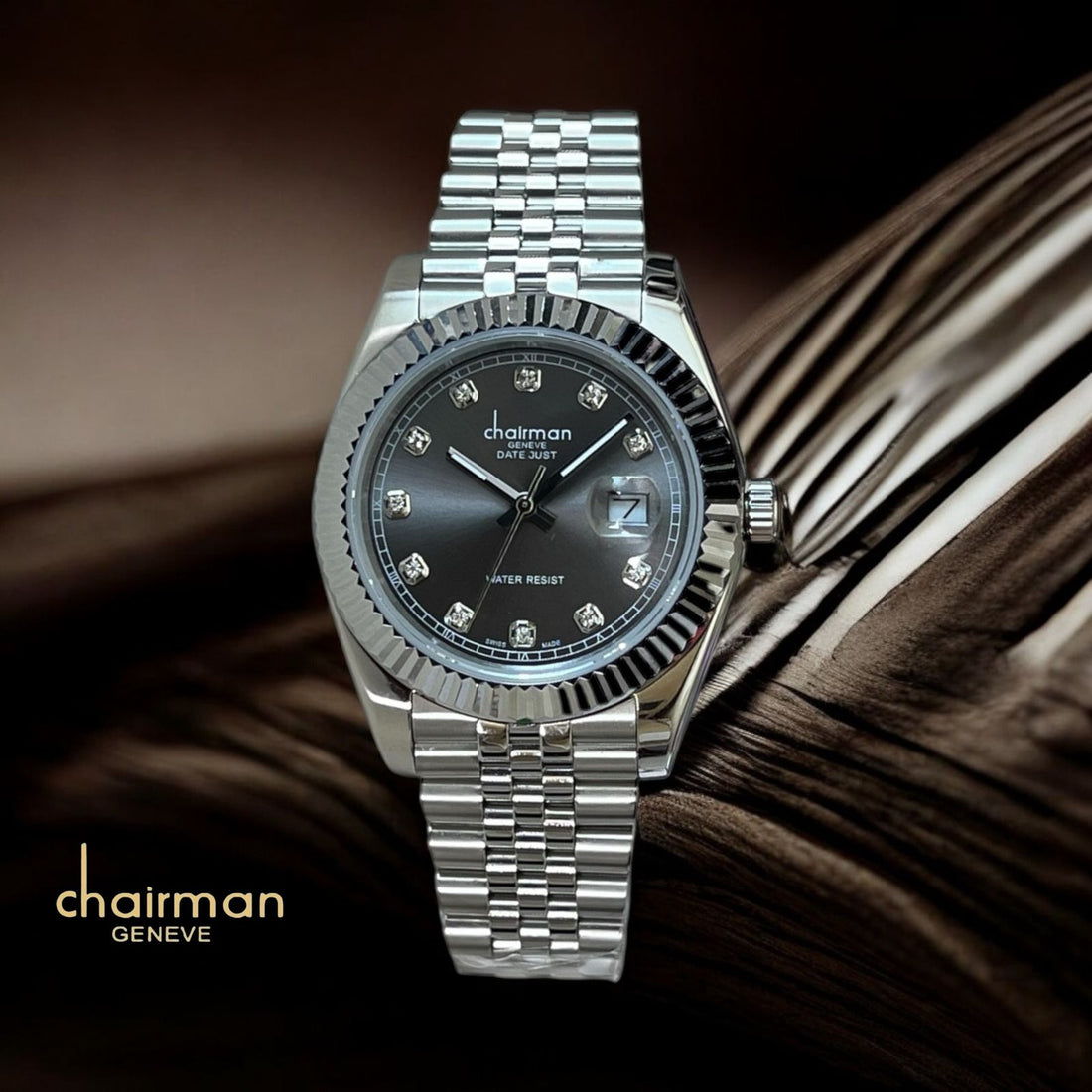 Chairman Geneve Water Resist Black Dated Dial Silver Chain Gents Watch