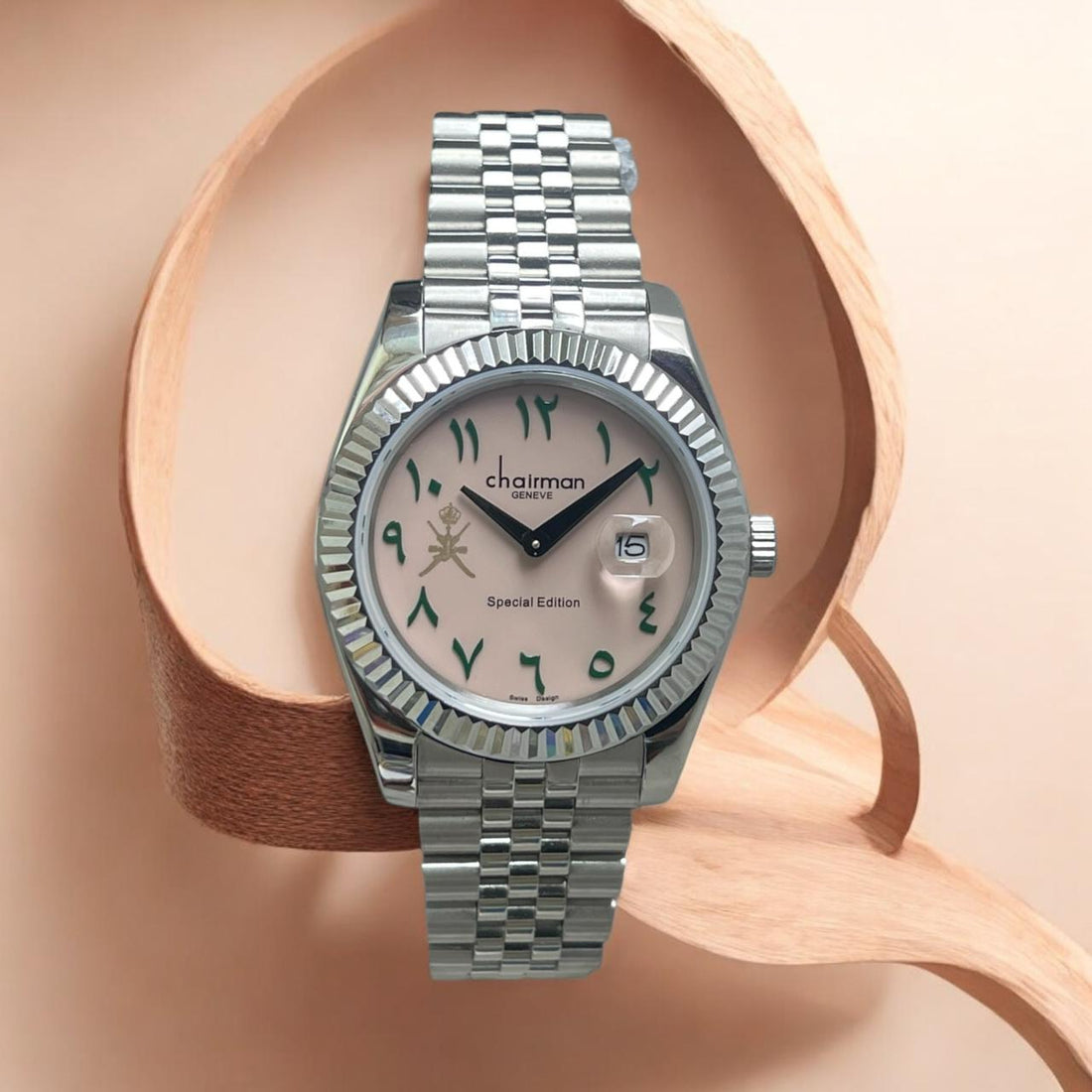 Upgrade your style with our Special Edition Chairman Geneve Arabic Dated Pink Dial Silver Chain...
