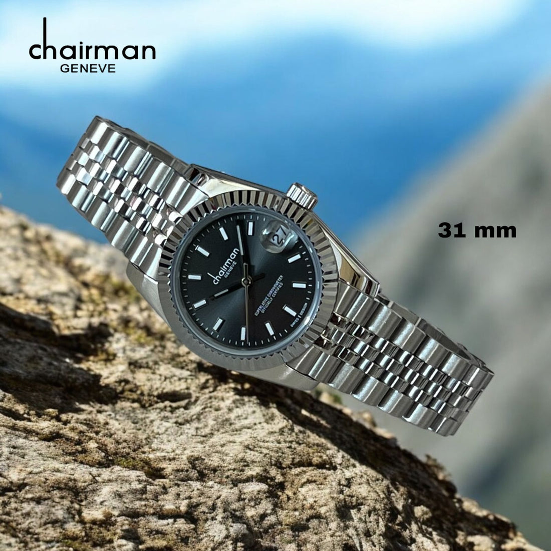 Chairman Geneve Dated Black Dial Silver Chain Men's Watch