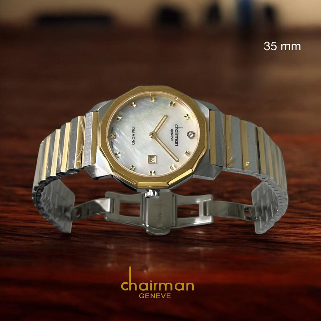 Diamond Chairman Geneve Dated White Marble Dial Silver And Gold Dial Ladies Watch