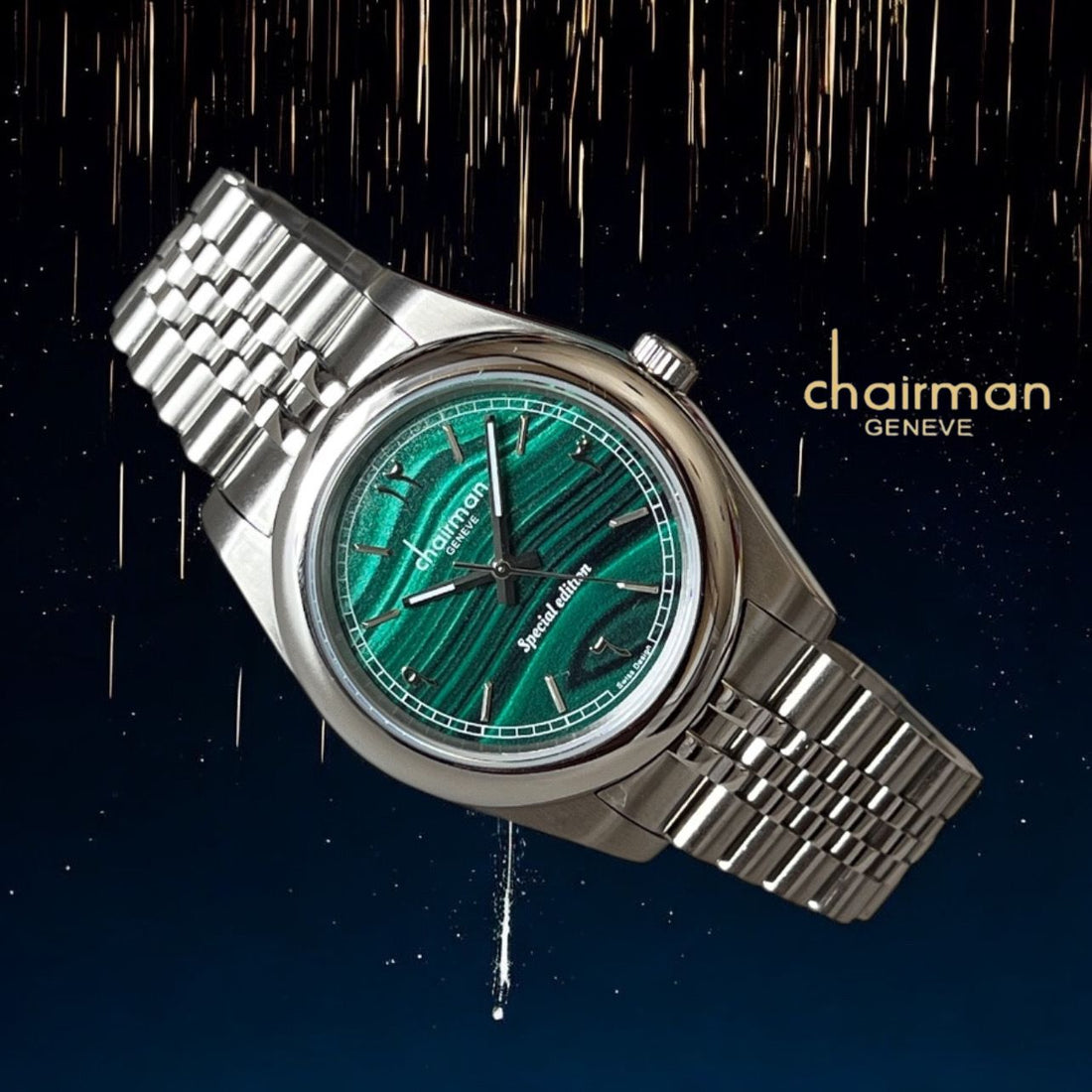 Special Edition Chairman Geneve Arabic Green Dial Silver Chain Gents Watch