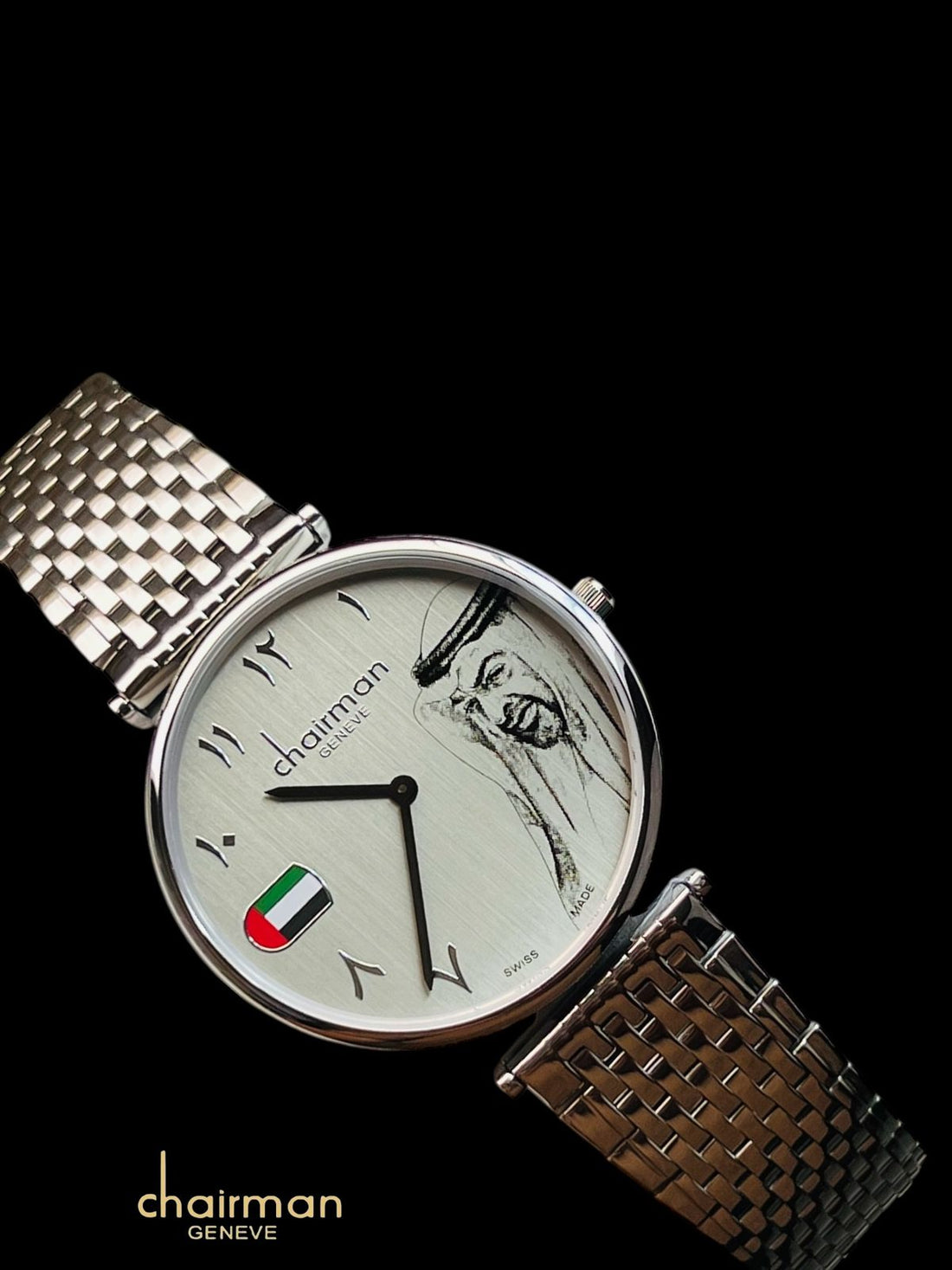 Chairman Geneve UAE Emblem Flag Arabic White Dial Silver Chain Gents Watch