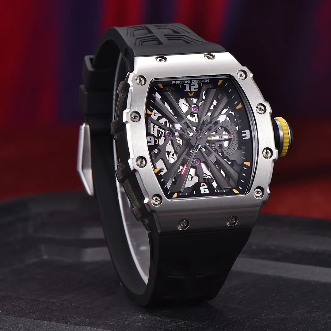 PAGANI DESIGN Quartz Watches Stainless Steel Waterproof Wrist Watch for Men with Black Silicone Watchband