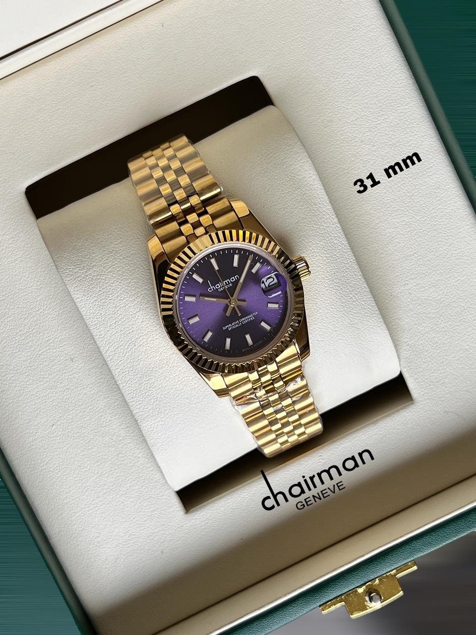 Chairman Geneve Dated Purple Dial Golden Chain Ladies Watch