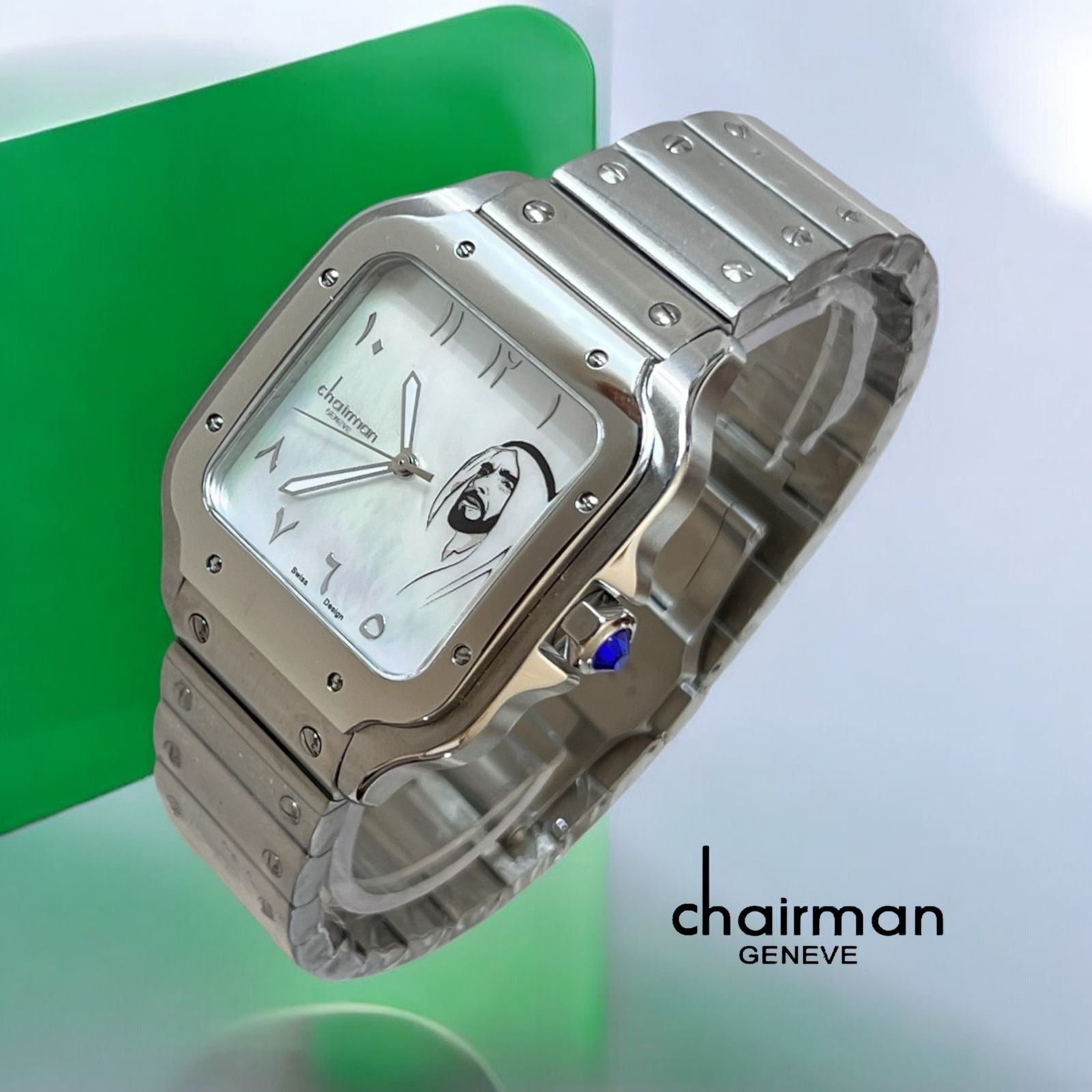 Elevate your style with the Cartier Chairman Geneve Gents Watch, featuring an elegant white dial adorned with Arabic UAE Sheik numerals. Its refined silver chain perfectly complements any outfit, making it an ideal accessory for discerning gentlemen. This timepiece blends classic design with cultural sophistication, offering both precision and timeless appeal.
