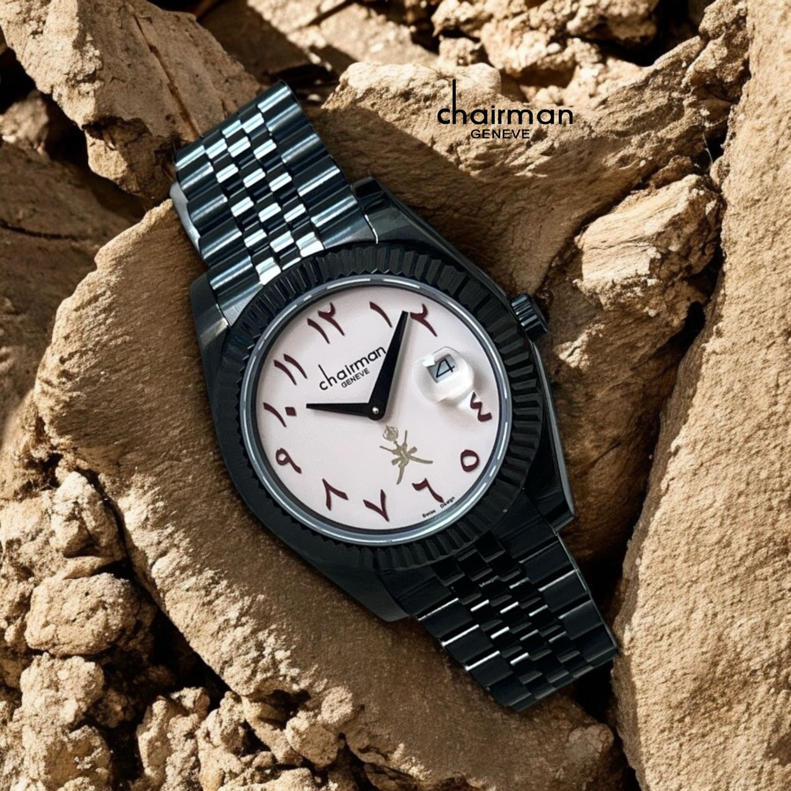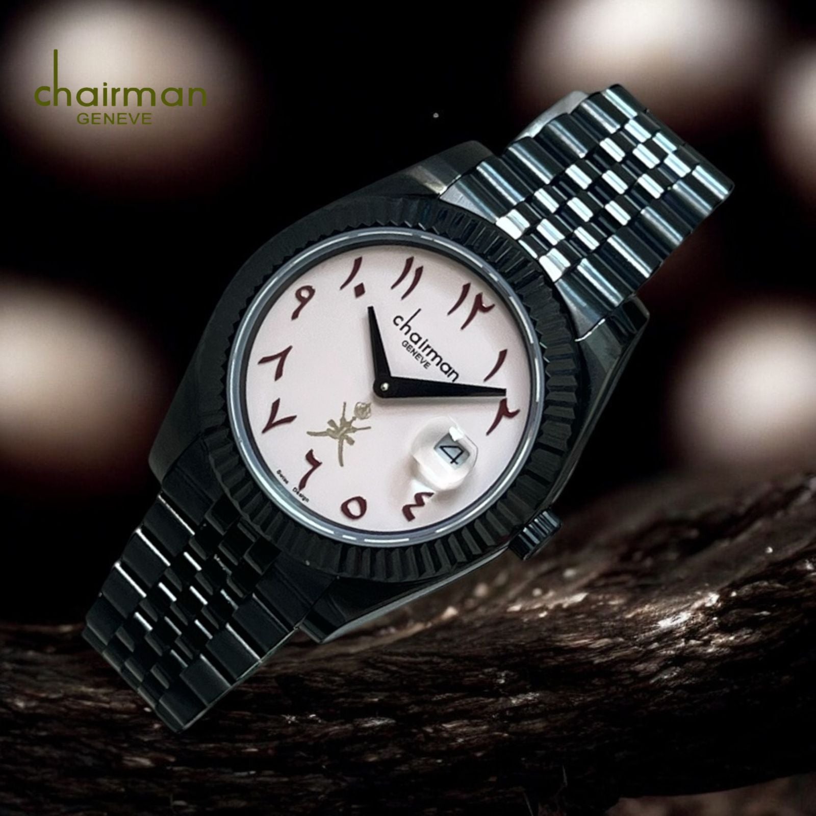 Introducing the Chairman Geneve Arabic Dated Pink Dial Black Chain Gents Watch! Sleek and stylish, this watch features an elegant pink dial with Arabic numerals and a durable black chain for effortless sophistication. Stay on schedule and stand out from the crowd with this must-have timepiece.