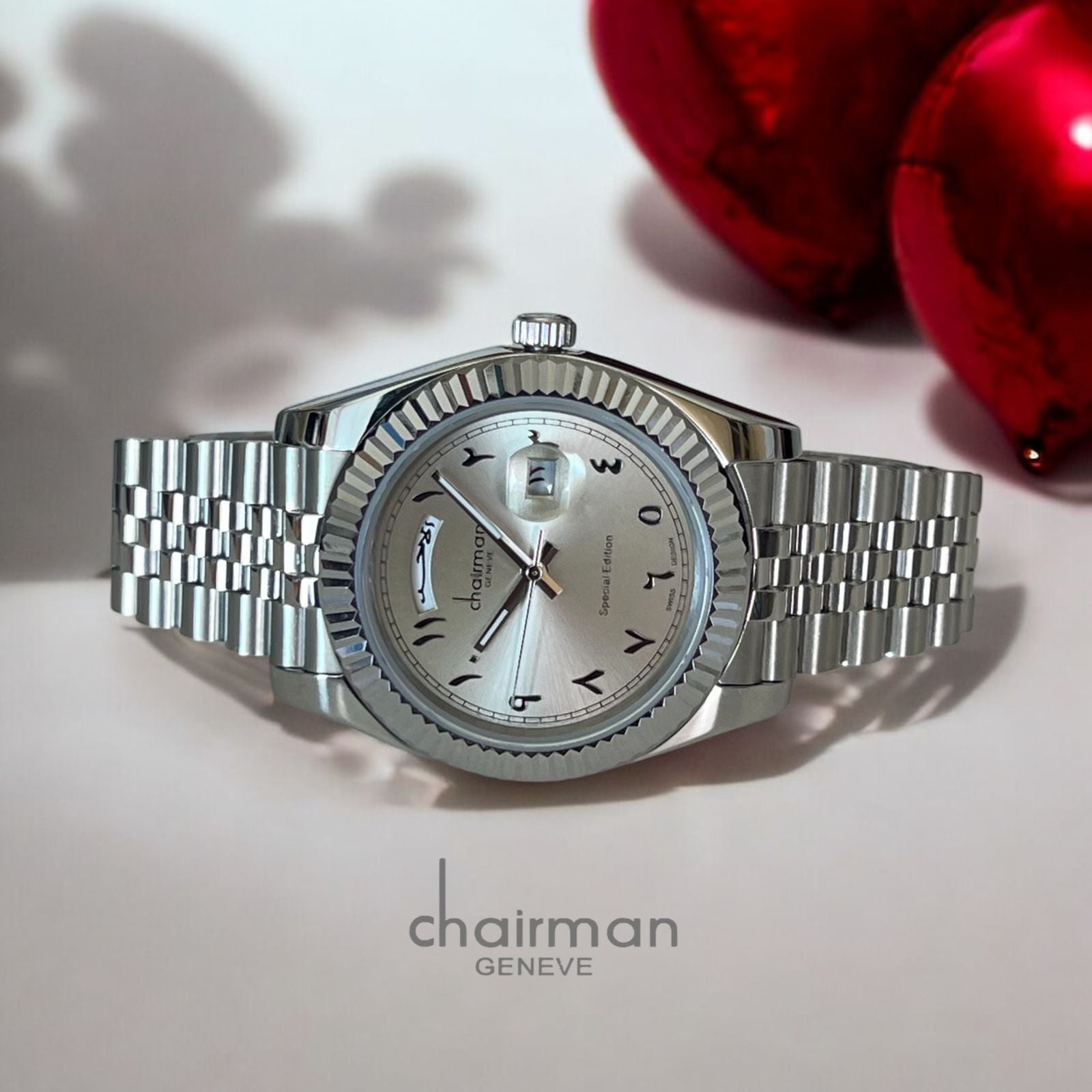 Introducing the Chairman Geneve Gents Watch - a sleek and stylish timepiece with a grey dial featuring Arabic numerals for easy readability. Keep track of your days and dates with the added day and date function. Complete your look with the silver strap for a touch of sophistication.