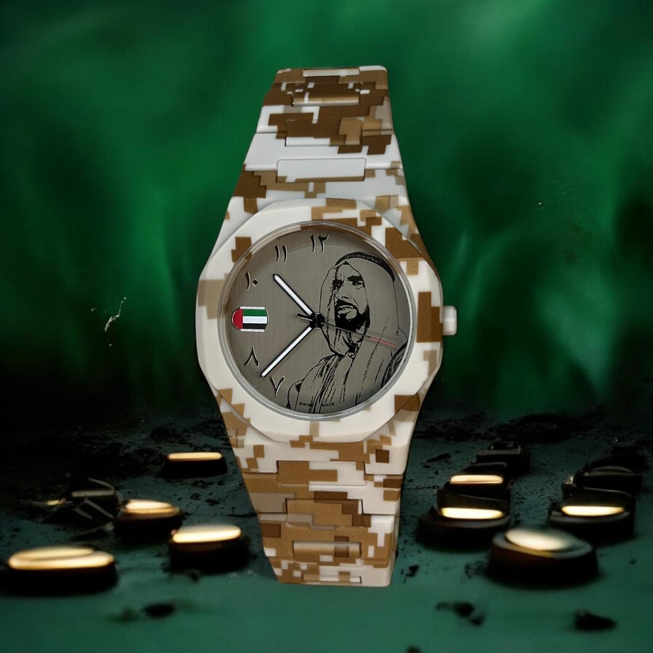 Experience elegance with the Chairman Geneve Gents Watch, featuring a distinctive grey dial accented by the iconic UAE flag and Arabic numerals. Its white and brown chain strap offers a stylish contrast, perfect for adding a touch of sophistication to any outfit. Designed for the modern gentleman, this watch combines cultural pride with timeless craftsmanship.