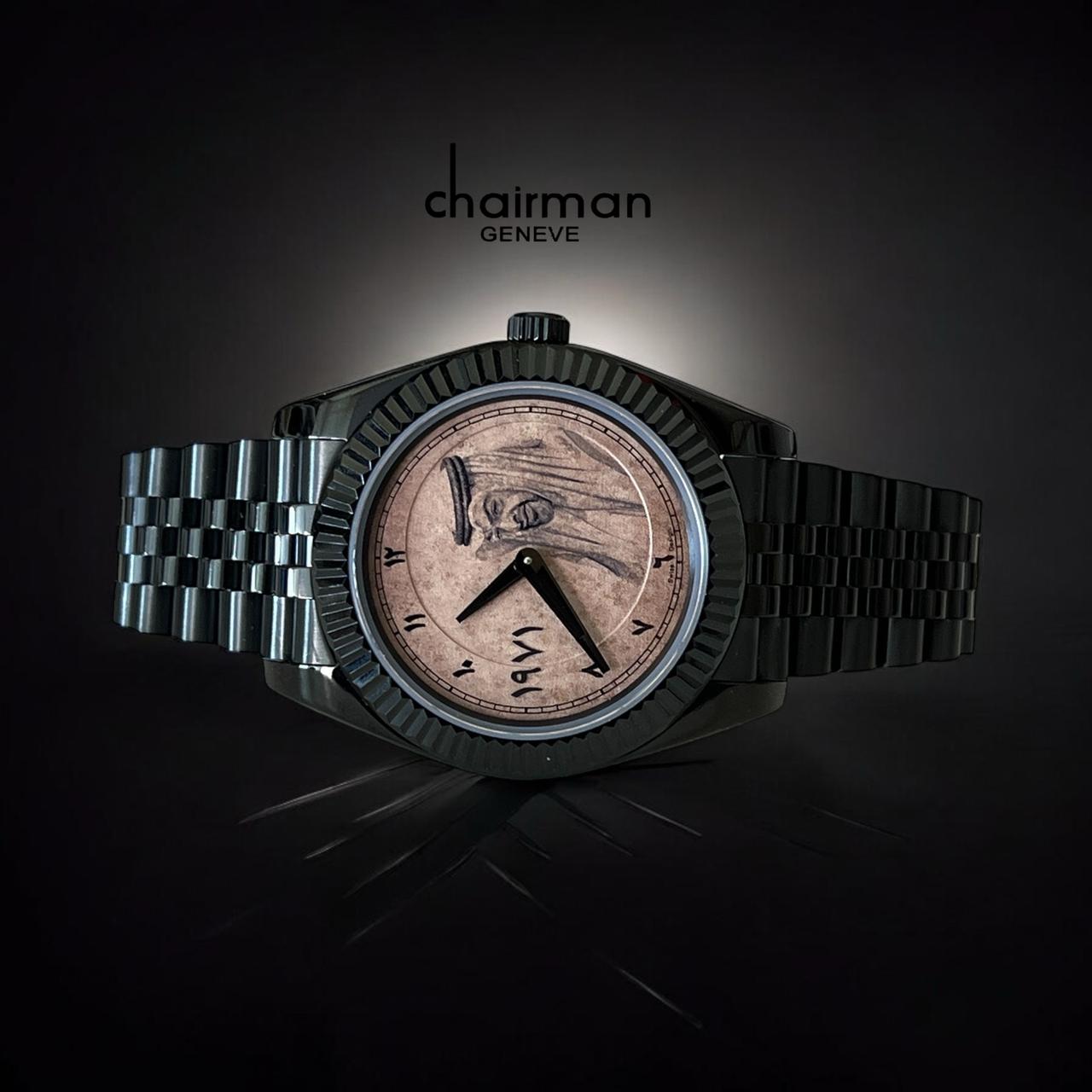 Elevate your style with the Chairman Geneve Black Chain Gents Watch featuring a unique UAE Sheik photo on the dial. Complete with a brown Arabic dial and a sleek black chain, this watch is the perfect accessory for any occasion. Make a statement with this elegant timepiece.