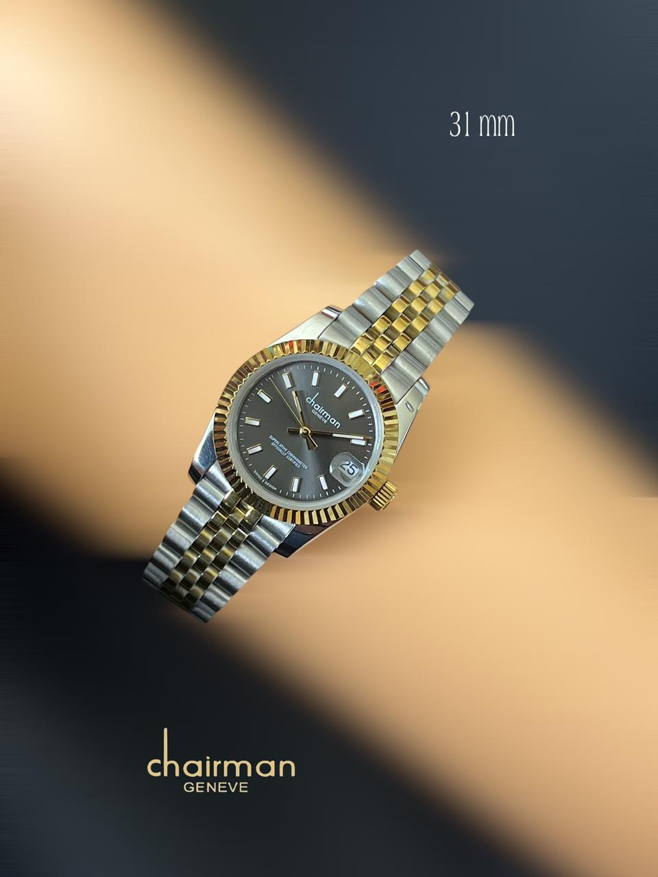 Experience timeless elegance with the Chairman Geneve Black Dated Dial Gold And Silver Strap Gents Watch. Its sleek black dial and luxurious gold and silver strap exude sophistication. Stay punctual with the handy date feature. Elevate your style with this stunning timepiece.