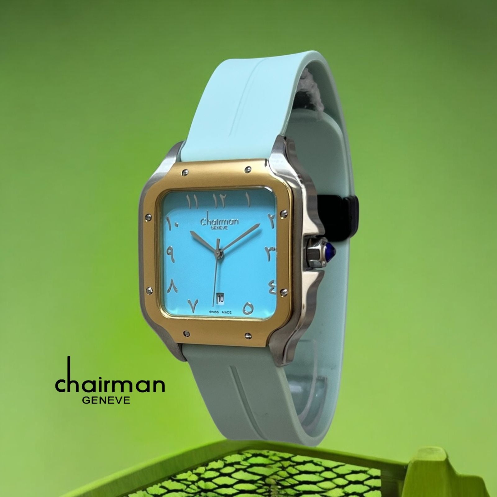 Elevate your style with the Chairman Geneve Gents Watch, featuring a striking sky blue dial and matching strap. Its dated Arabic numerals offer a unique blend of classic design and modern flair, perfect for the discerning gentleman. This watch combines elegant aesthetics with practical functionality, making it an ideal accessory for both daily wear and special occasions.