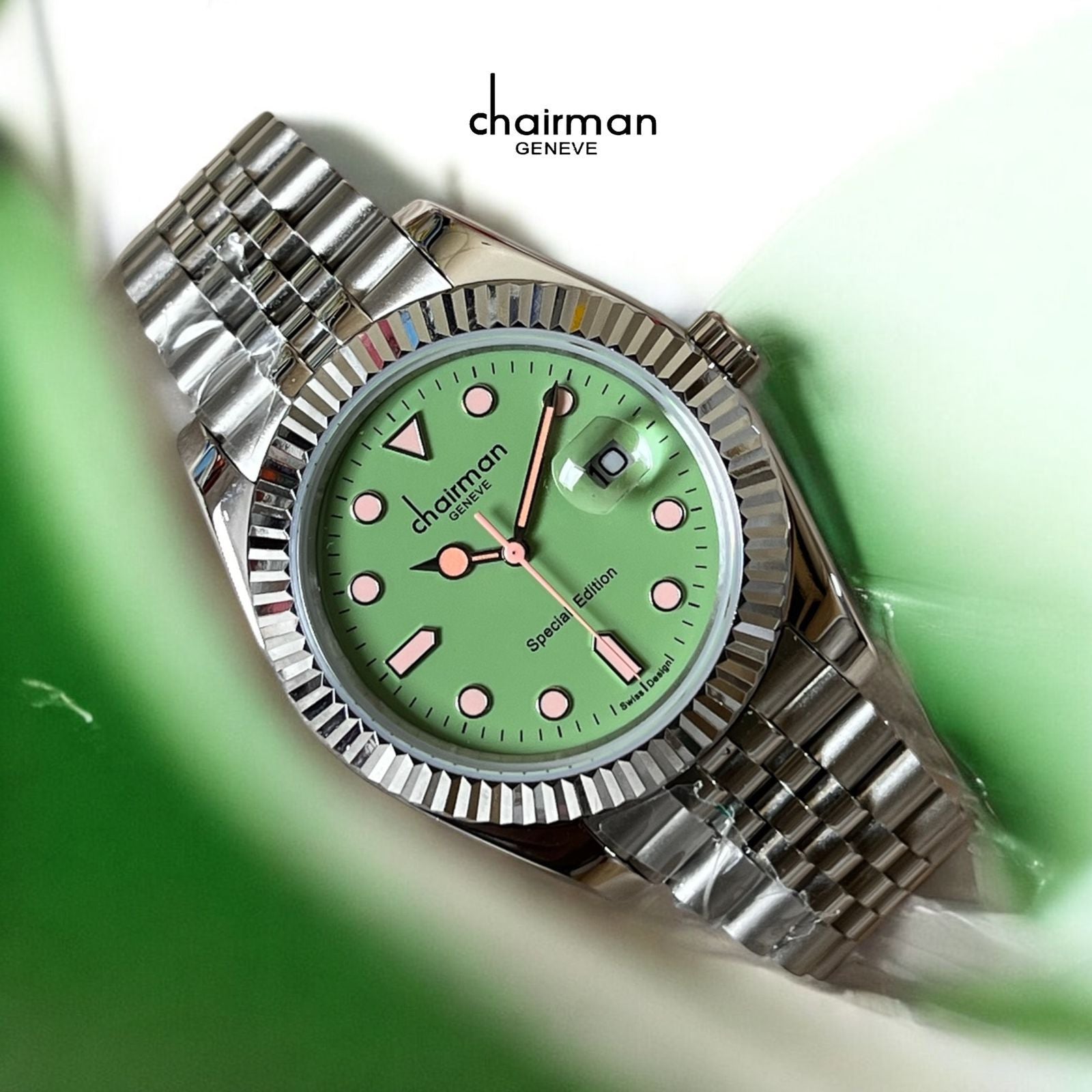 Chairman Geneve Dated Green Dial Silver Chain Gents Watch