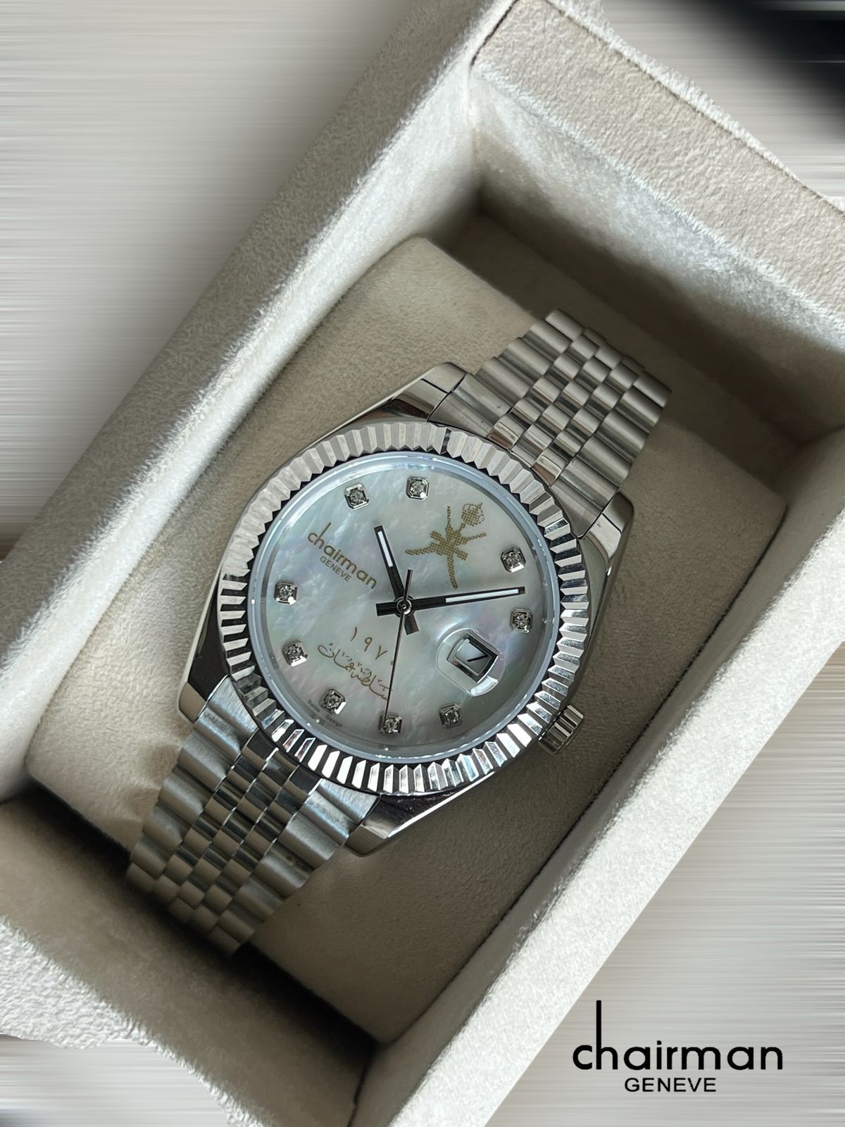 Elevate your style with the Chairman Geneve Dated White Marble Dial Silver Chain Gents Watch. Featuring a unique white marble dial, this watch adds a touch of sophistication to any outfit. With a sleek silver chain, this watch can be worn for any occasion. Stay punctual and fashionable with this timepiece.