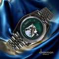 Elevate your style with the Chairman Geneve Horse Gents Watch, featuring a striking green dial detailed with Arabic numerals and a practical date display. The silver chain strap adds a refined touch, perfectly complementing the elegant horse motif. Designed for the discerning gentleman, this watch combines classic craftsmanship with everyday functionality.