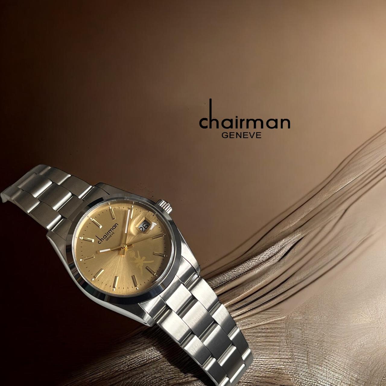 Chairman Geneve Oman Emblem Dated Golden Dial Silver Chain Gents Watch
