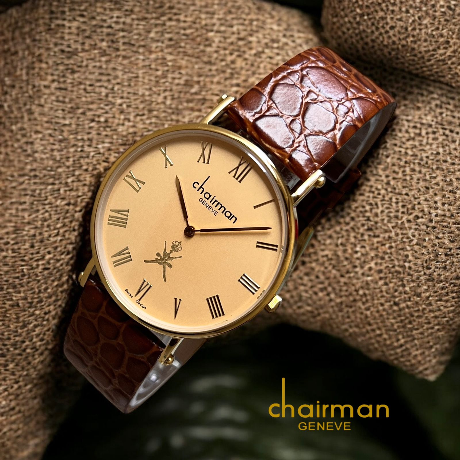 Elevate your style with the Chairman Geneve OMAN Emblem watch, featuring a sophisticated beige dial adorned with classic Roman numerals. The rich brown strap complements the elegant design, making it a perfect accessory for the modern gentleman. This timepiece blends tradition and refinement, ideal for both formal occasions and everyday wear.
