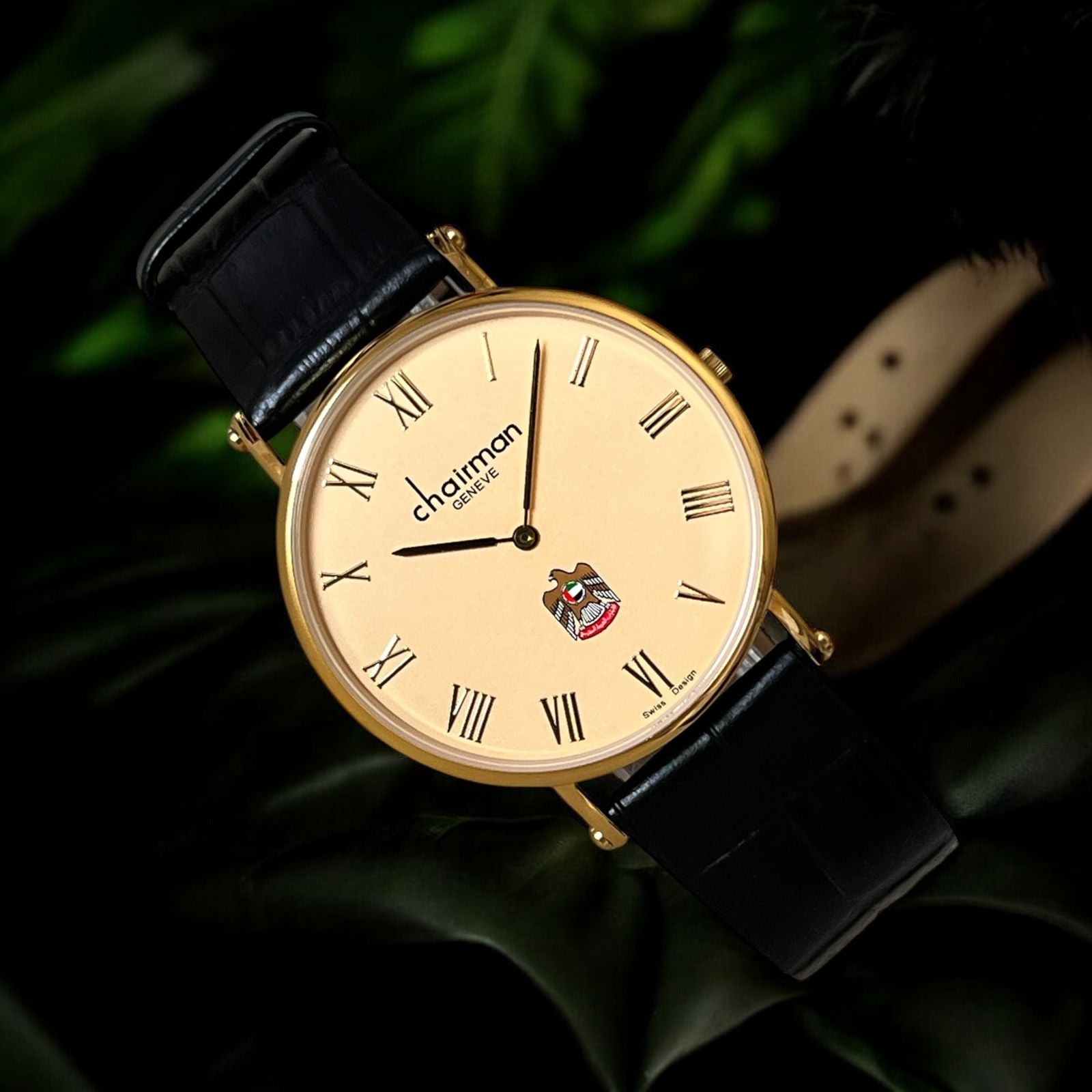 Chairman Geneve Roman Numeral Beige Dial UAE Emblem Black Strap Gents Watch