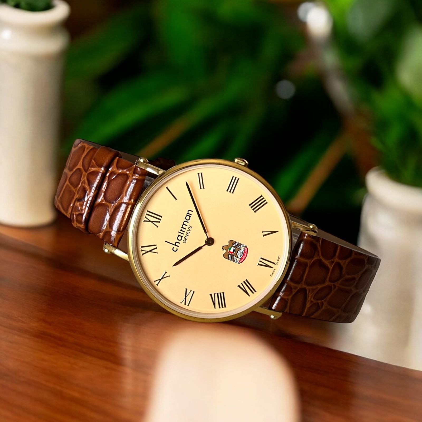 Elevate your style with the Chairman Geneve Gents Watch, featuring a classic beige dial adorned with Roman numerals and the distinctive UAE emblem. Its vintage brown strap adds timeless elegance, making it perfect for sophisticated everyday wear. This watch combines heritage design with modern craftsmanship, offering both reliability and a refined look for the discerning gentleman.