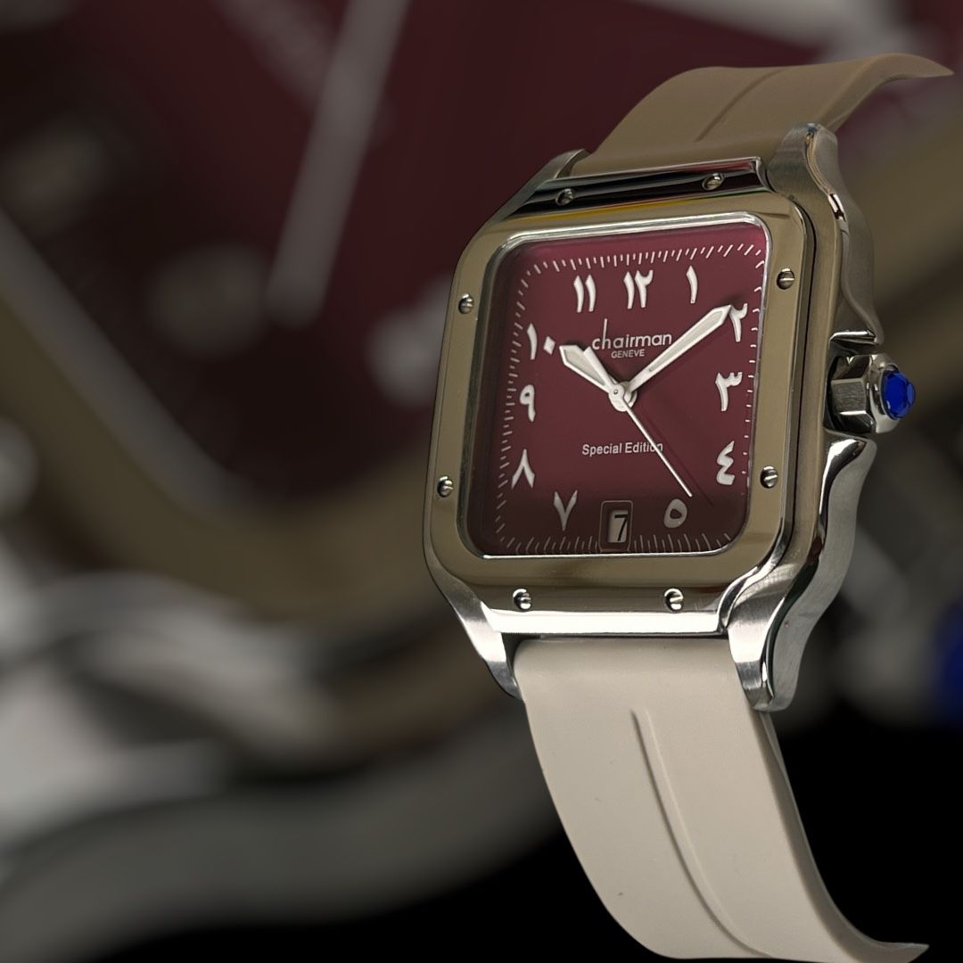 Elevate your style with the Chairman Geneve Special Edition Gents Watch, featuring a rich maroon dial accented by elegant Arabic numerals. The beige strap offers a sophisticated contrast, ensuring comfort and timeless appeal. This exclusive timepiece combines classic design with precise date functionality, making it the perfect accessory for the modern gentleman.