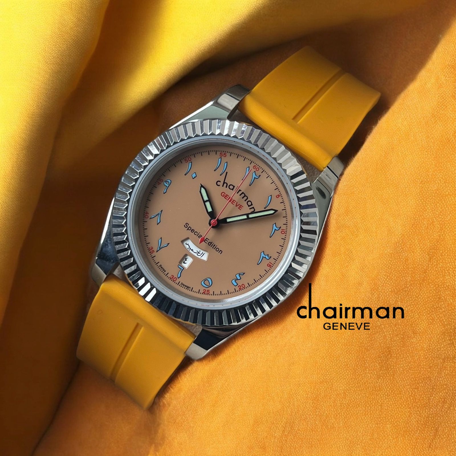 Experience luxury with the Chairman Geneve Special Edition Arabic Day And Dated Beige Dial Yellow Strap Gents Watch. The elegant beige dial showcases the day and date, while the yellow strap adds a vibrant touch. Perfect for any occasion, this watch is a statement piece that combines style and functionality. FREE DELIVERY CASH ON DELIVERY ALL OVER UAE