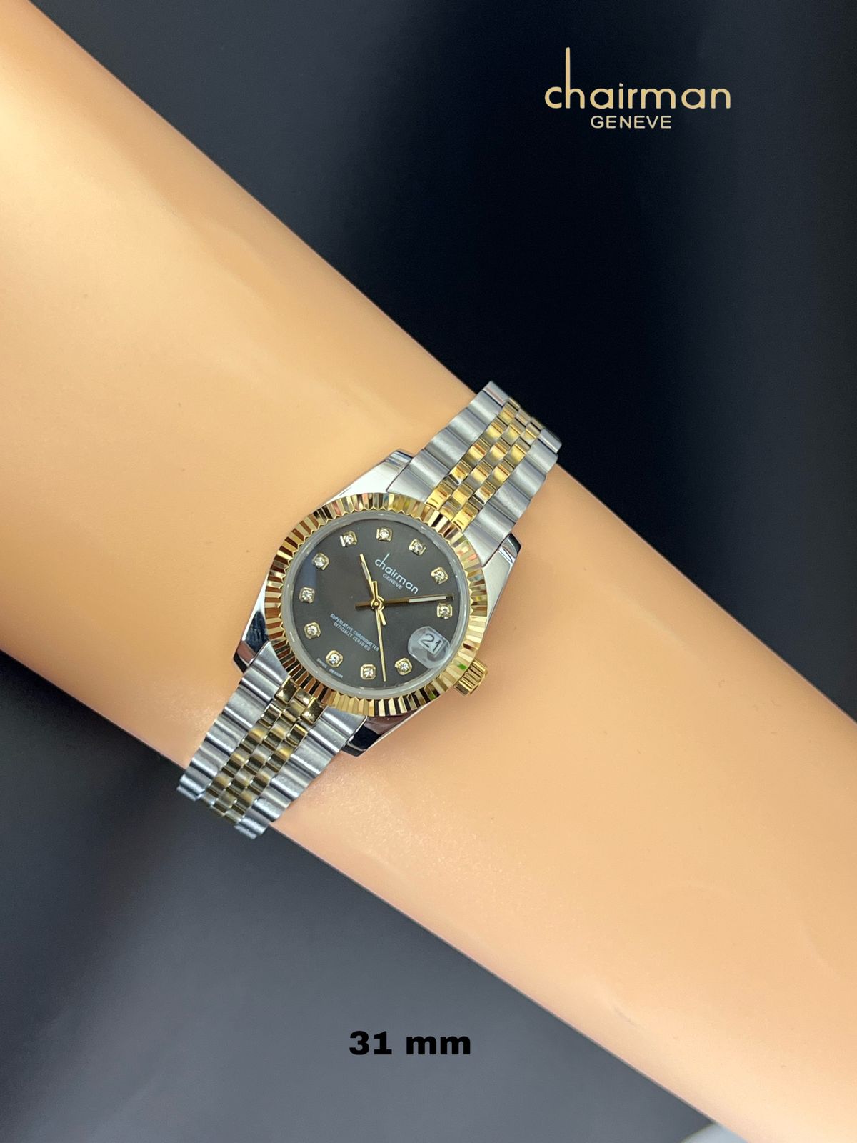 Introducing the ultimate gent's watch from Chairman Geneve. With a sleek silver and gold chain and a striking black dated dial, this timepiece is sure to make a statement. Encompassing luxury and style, it's perfect for any occasion. FREE DELIVERY CASH ON DELIVERY ALL OVER UAE