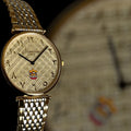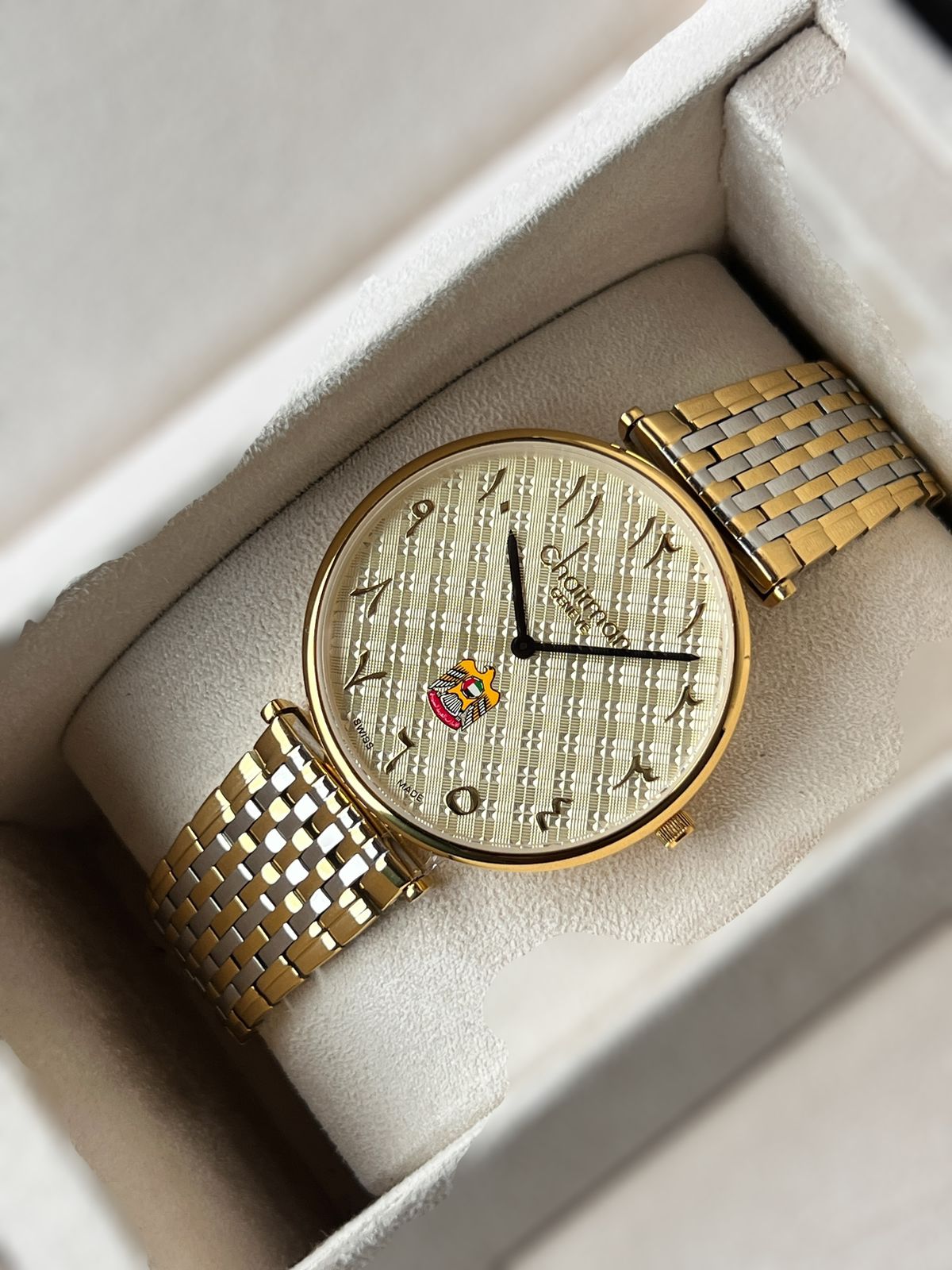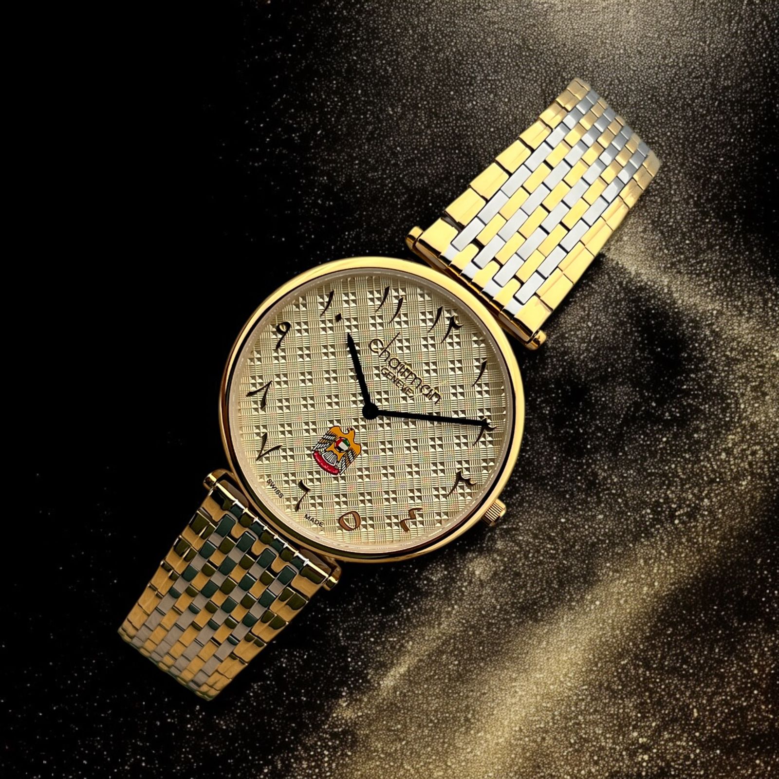 Chairman Geneve UAE Emblem Arabic Golden Dial Gold And Silver Chain Gents Watch