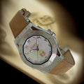 Elevate your wrist with the Chairman Geneve UAE Emblem watch, a sophisticated timepiece that blends heritage with contemporary elegance. Featuring an exquisite white marble dial adorned with Arabic numerals and the prestigious UAE emblem, this gents watch makes a bold statement of pride and refinement. The rich brown leather strap complements the dial's pristine finish, creating a harmonious aesthetic perfect for both formal occasions and everyday wear. Precision-engineered for reliability, this timepiece captures the essence of Arabian craftsmanship and timeless style.
