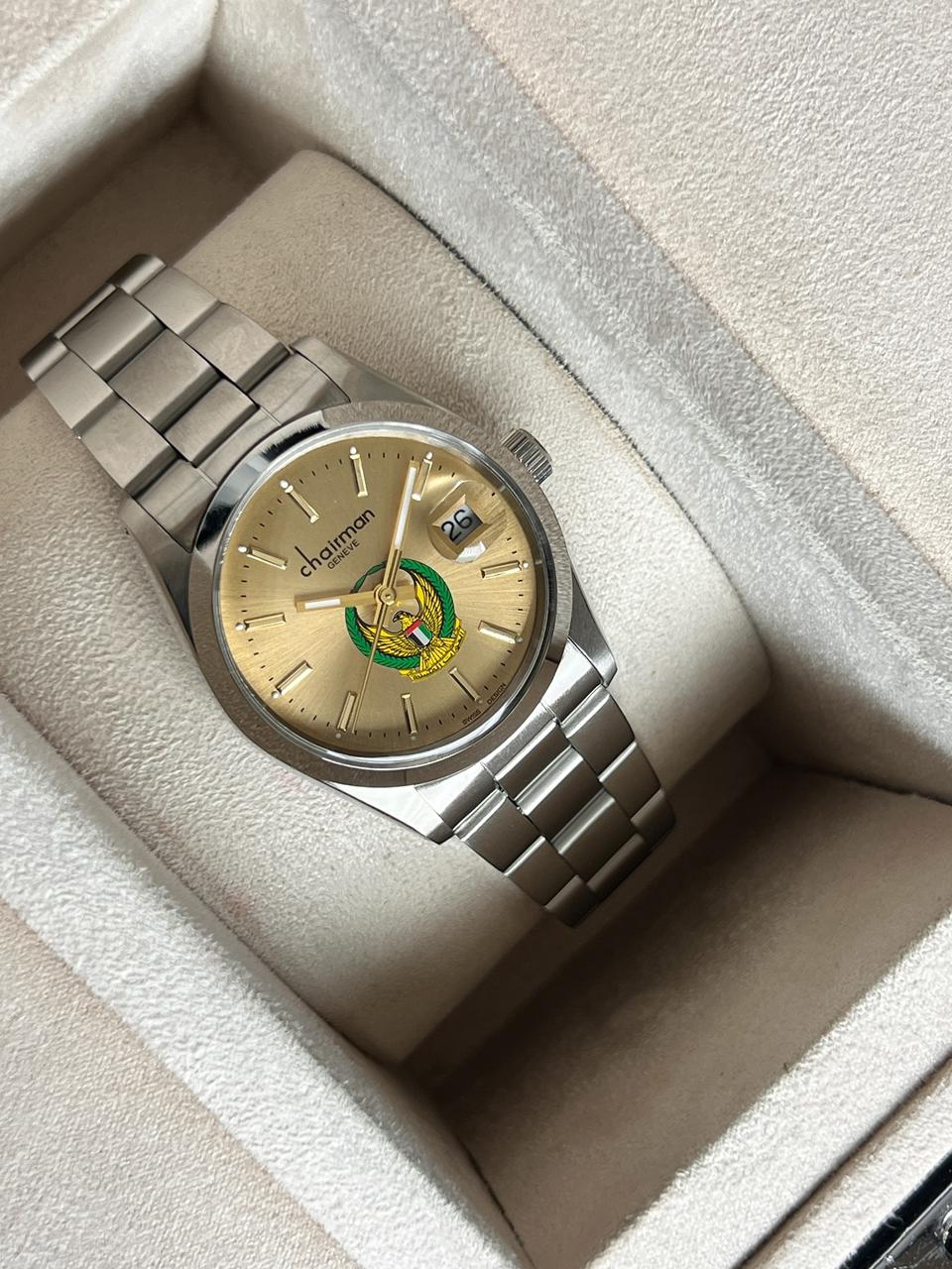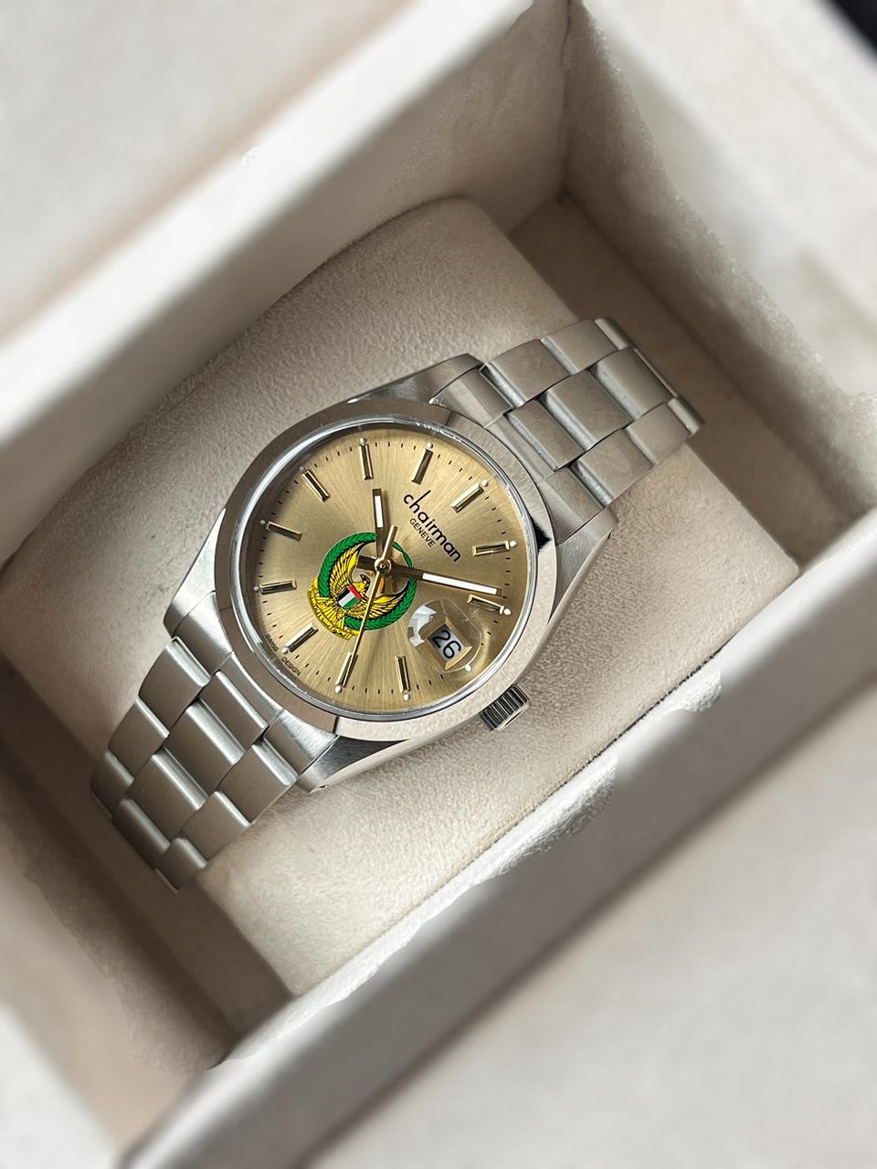 Elevate your style with the Chairman Geneve UAE Emblem watch, featuring a sophisticated golden dial adorned with the prestigious UAE emblem. This distinguished timepiece combines luxury and patriotism with its precision date function and premium silver chain bracelet. Perfect for the discerning gentleman who appreciates exquisite craftsmanship and national pride in one elegant accessory.
